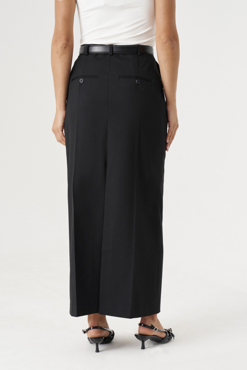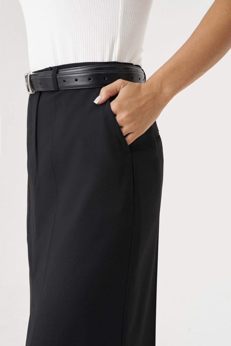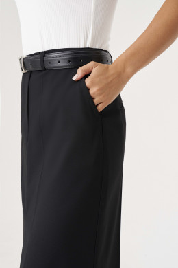Юбка женская из смесовой ткани для повседневной носки. Верхний срез юбки обработан притачным поясом с застежкой на одну петлю и одну пуговицу, имеется застежка на тесьму-молнию и разрез в среднем шве переднего полотнища юбки. Заднее полотнище юбки имеет средний шов и вытачки, входящие в прорезной карман с листочкой, а также разрез в среднем шве. Юбка имеет в боковом шве карман с подкройным бочком. Юбка станет незаменимой в вашем гардеробе, она придаст вам изящный вид фигуры и комфорт в носке.