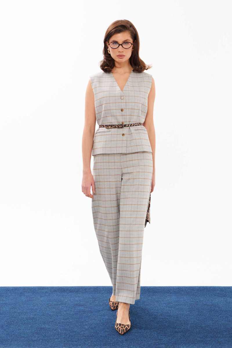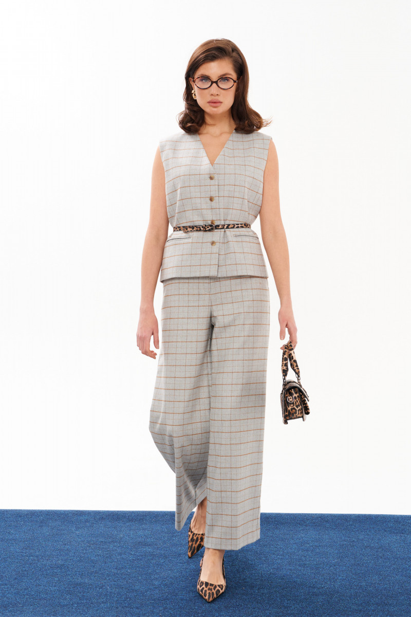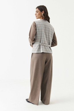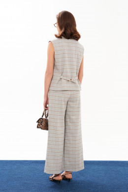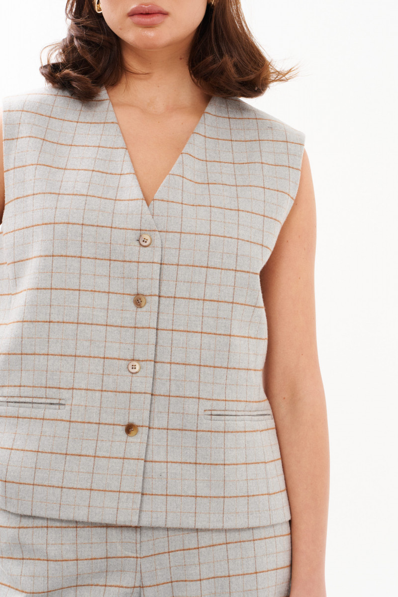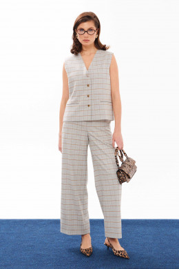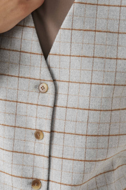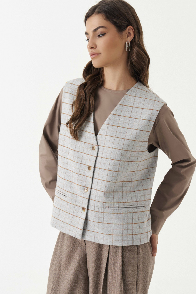 Жилет женский из смесовой ткани в клетку для повседневной носки. Жилет полуприлегающего силуэта. Жилет с центральной бортовой застежкой на четыре обметанные петли и четыре пуговицы. Перед имеет два вертикальных рельефа, идущих от проймы до низа изделия, а также на переде располагается карман с двумя обтачками. Спинка с двумя рельефами, идущими от проймы до линии низа изделия. Спинка имеет хлястик. Горловина V-образная. Жилет на поливискозной подкладке. Данное изделие станет отличным дополнением к любому гардеробу. И обязательно осчастливит его обладательницу своим прекрасным фасоном.