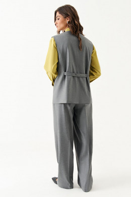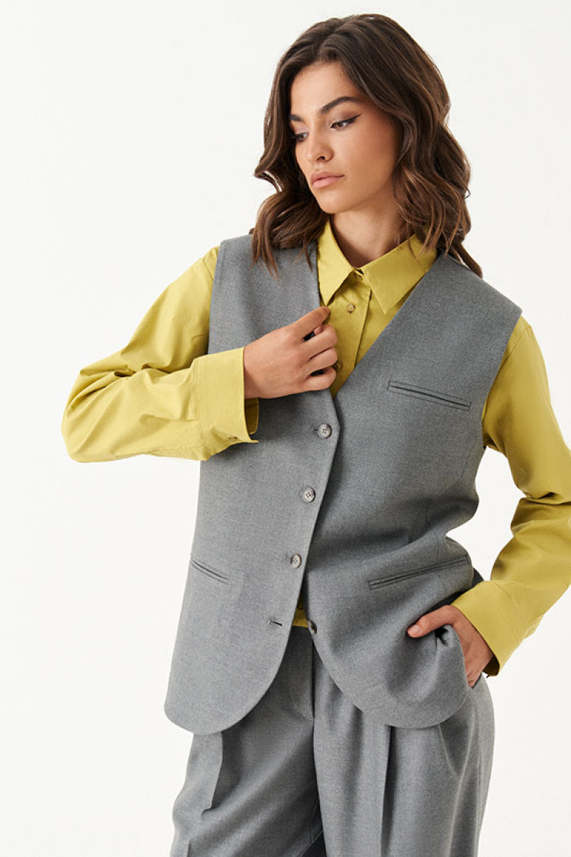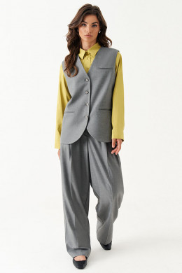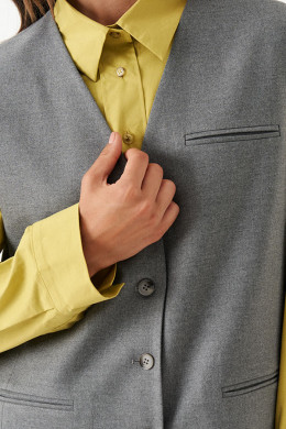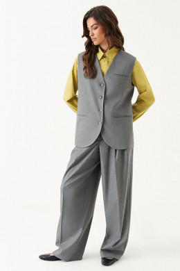 Жилет женский из смесовой ткани для повседневной носки на подкладке. Жилет полуприлегающего силуэта. Жилет с центральной бортовой застежкой на четыре обметанные петли и четыре пуговицы. Перед имеет два вертикальных рельефа, идущих от проймы до низа изделия, а также на переде располагается нагрудный карман " в рамку". По переду имеется прорезные карманы в " рамку". Спинка со средним швом и с двумя рельефами, идущими от проймы до линии низа изделия. Спинка имеет хлястик с застежкой на две обметанные петли и две пуговицы. Горловина V-образная. Данное изделие станет отличным дополнением к любому гардеробу. И обязательно осчастливит его обладательницу своим прекрасным фасоном.
