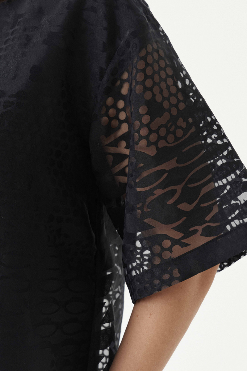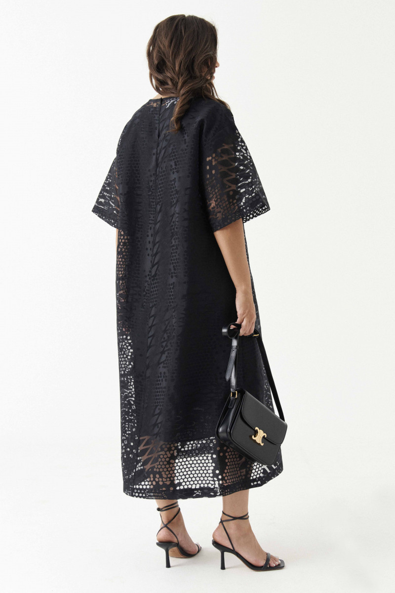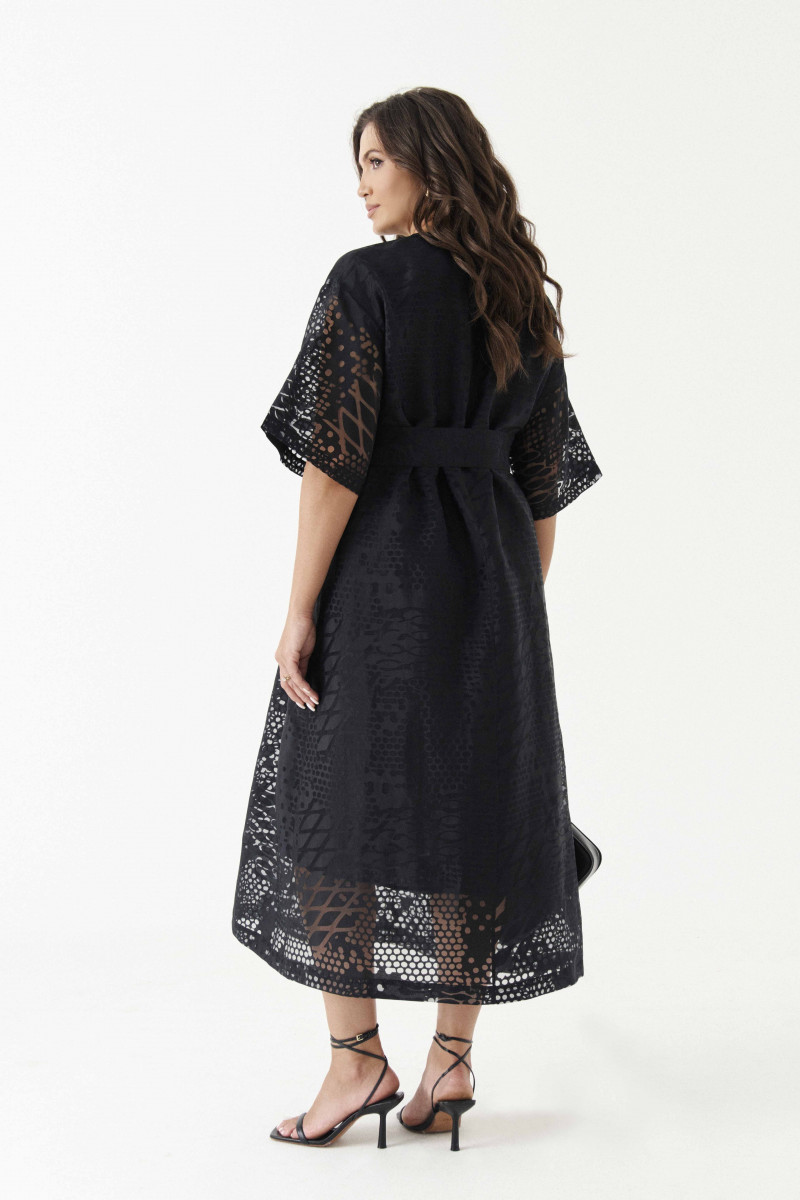 Платье женское из органзы, слегка просвечивающееся. Платье расширенного силуэта. Спинка с разрезом и петлёй-пуговицей в среднем шве. Горловина слегка расширена. Линия плеча чуть спущена. Рукав короткий расширенный. Имеется пояс из основной ткани для придания формы изделию. Нижнее платье, подкладка изготовлена из вискозы, прямого силуэта. В подкладке платья перед имеет две нагрудные вытачки. Отличный вечерний вариант для прогулки или свидания. Платье дышащее и комфортное к телу. Платье для различного рода мероприятий и встреч.