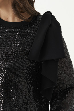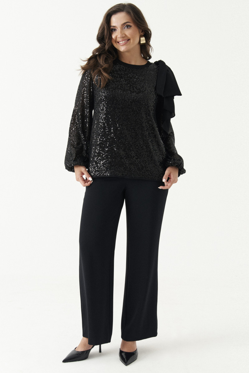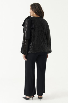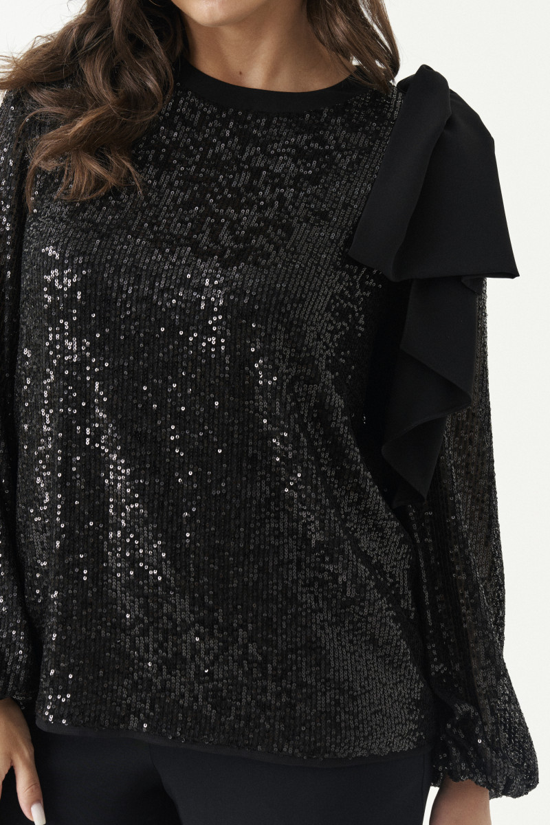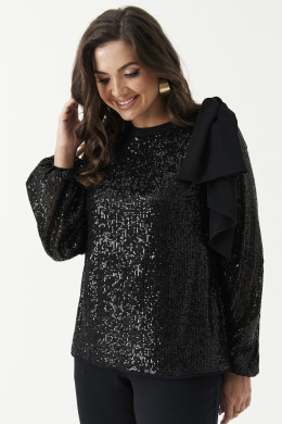 Блузка женская из полиэфирного волокна для торжественных мероприятий прямого силуэта. Блузка с пайетками. Спинка с застежкой на тесьму-молнию. Горловина обработана притачной тесьмой. Низ рукава расширен к низу и обработан притачной манжетой на резинке. В качестве декорации имеется накладной бант. Очень красивое и завораживающее изделие, которое не оставит никого равнодушным.