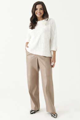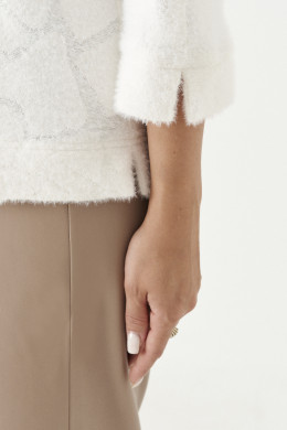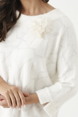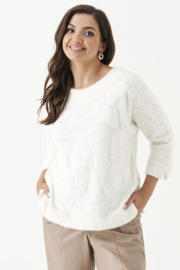 Джемпер женский из поливискозного трикотажного полотна для повседневной носки. Изделие полуприлегающего силуэта с укороченным цельнокроеным рукавом. Рукав оформлен притачной манжетой. По переду дизайнерский декор. Длина изделия классическая.