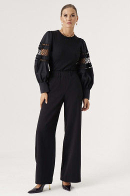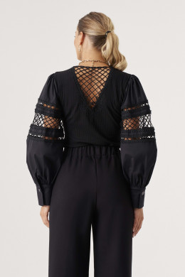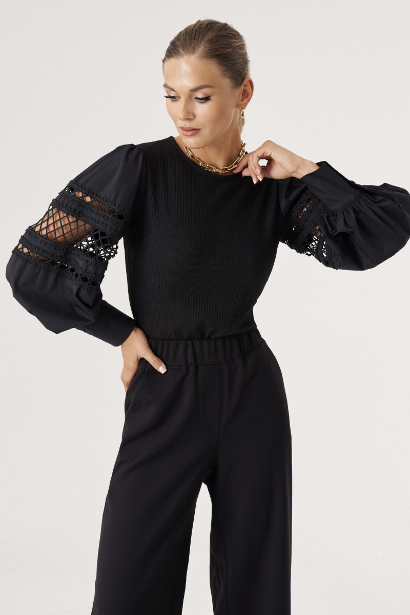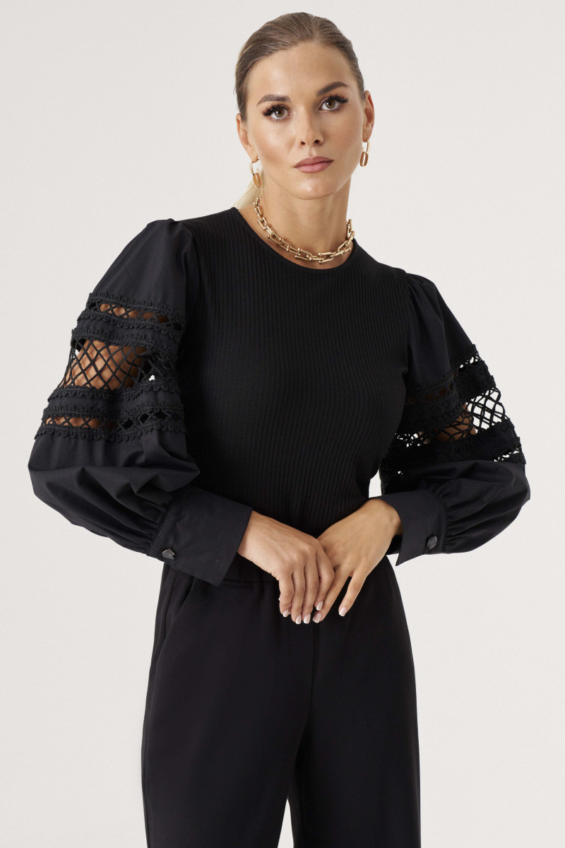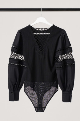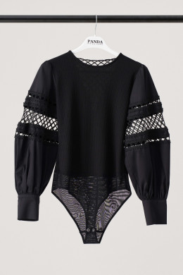 Джемпер (боди) женский из вискозного трикотажного полотна прилегающего силуэта. Рукава втачные из хлопковой ткани, с декоративным узором-- вышивка шнуром, низ рукава обработан притачной манжетой с застежкой на одну обметанную петлю и одну пуговицу. По окату рукава и по шву притачивания манжеты имеется сборка. Рукава объёмные. По спинке V-образная горловина. Низ изделия выполнен в виде трусиков из сетки, что облегчает одевание, застежка на две кнопки. Отлично будет смотреться с брюками или юбкой. Очень стильное боди, которое отлично подчеркнет ваши достоинства фигуры. В этом изделии вы всегда будете в центре внимания.