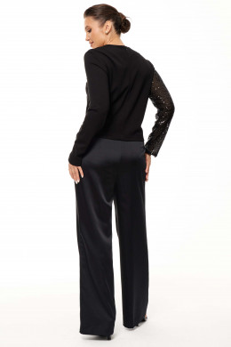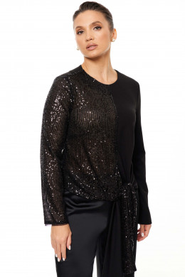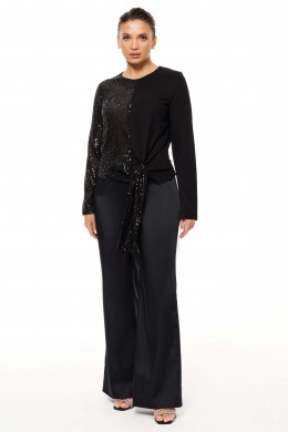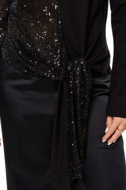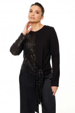 Блузка женская из струящейся ткани прилегающего силуэта для торжественных мероприятий. Перед имеет отрезные детали на завязке с пайетками. Спинка имеет средний шов с застежкой на тесьму-молнию в среднем шве. Рукава втачные длинные. Изящная и элегантная блузка отлично будет смотреться на любой фигуре, а главное то, что блузка очень комфортное в носке.