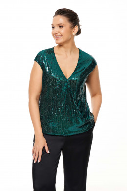 Блузка женская прямого силуэта для торжественных мероприятий. Блузка из ткани с пайетками, подкладка из струящейся ткани. Перед на запах с застежкой на кнопку. Горловина V-образная. Блузка не имеет рукавов. Очень стильная и удобная блузка, в которой бы будете чувствовать себя уверенней, а главное вы всегда будете в центре внимания.
