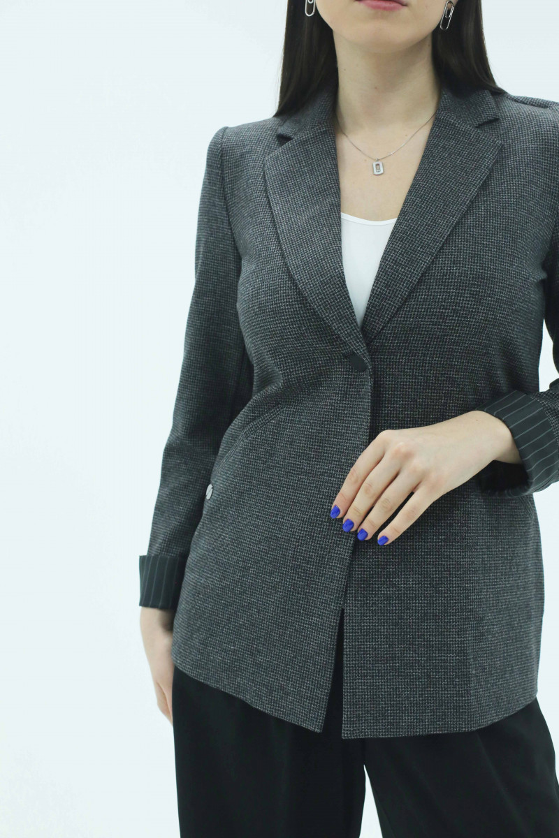 Очень стильный удлинённый жакет выполнен из плотного и приятного на ощупь, эластичного трикотажного полотна. Рукав втачной длинный. Снизу обтачен подкладочной тканью с принтом в тонкую полосочку. Низ рукава можно отвернуть, как манжет. Воротник отложной пиджачного типа. Застёжка спереди на одну петлю-пуговицу. Спереди выполнены прорезные карманы с листочкой. По спинке выполнена отрезная кокетка и средний шов. Жакет без подкладки и максимально комфортен в эксплуатации. Идеально подходит как вариант на каждый день и в офис для предприимчивой и активной девушки, предпочитающей стильные и практичные вещи.