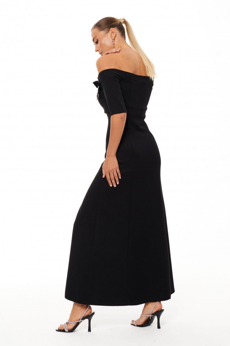 Элегантное вечернее платье для женщин станет идеальным выбором для любого торжества или делового мероприятия. Выполненное из высококачественного вискозного трикотажного полотна, оно сочетает в себе классический и нарядный стиль, подчеркивая фигуру и создавая эффектный образ. Платье оснащено прилегающим лифом, который плавно переходит в расклешенную юбку с коктейльным разрезом спереди, добавляющим нотку элегантности и дерзости. Верх с открытыми плечами придает образу модный и стильный акцент, подчеркивая женственность и утонченность.