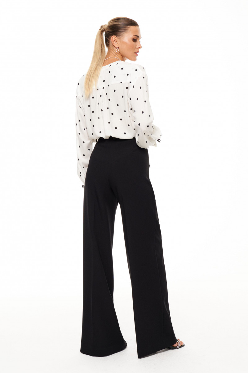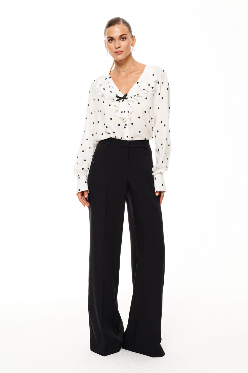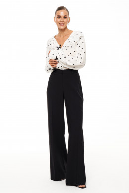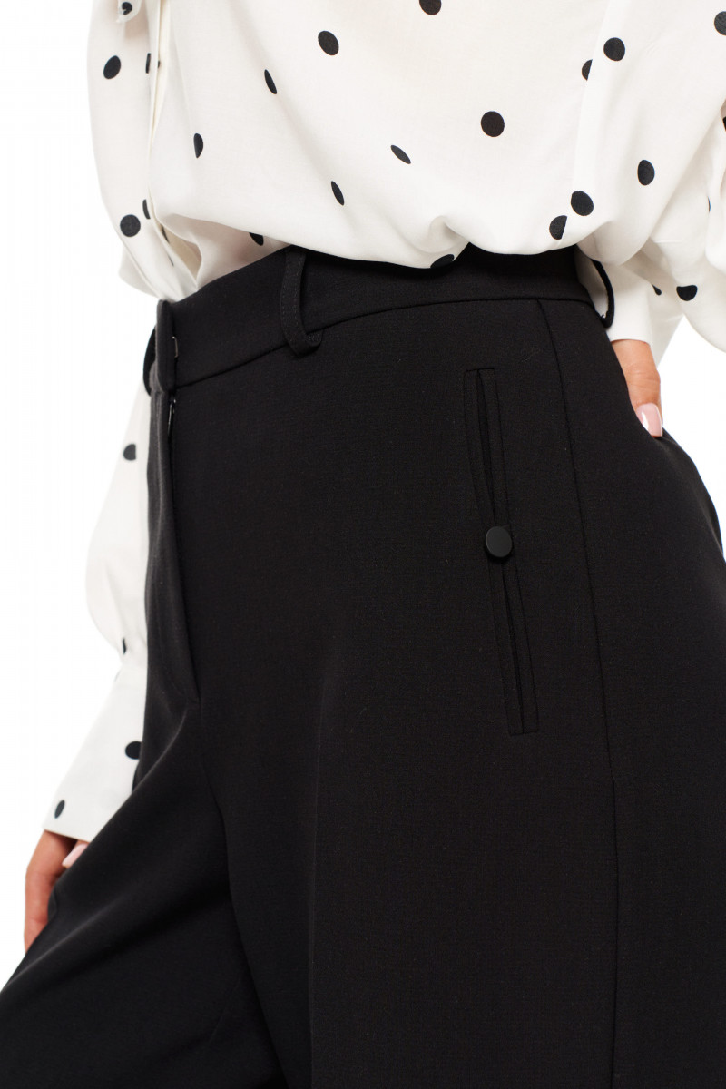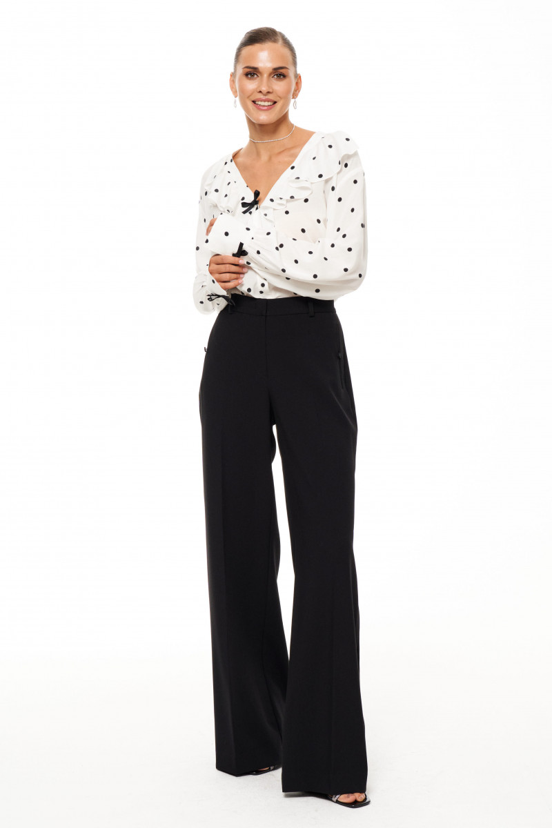 Брюки женские прямые из смесовой ткани для повседневной носки. Верхний срез брюк обработан притачным поясом, застежка на один крючок, а также имеется застежка на тесьму-молнию в среднем шве брюк. В брюках имеются шлёвки, что позволяет носить их под ремень. Задняя часть брюк имеет две талиевые вытачки. На передней части брюк расположен карман в рамку с застежкой на петлю и пуговицу. Отличный классический вариант брюк, которые будут гармонично смотреться под любые изделия.