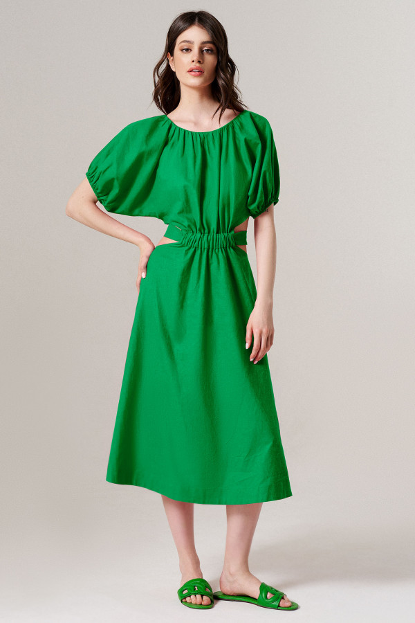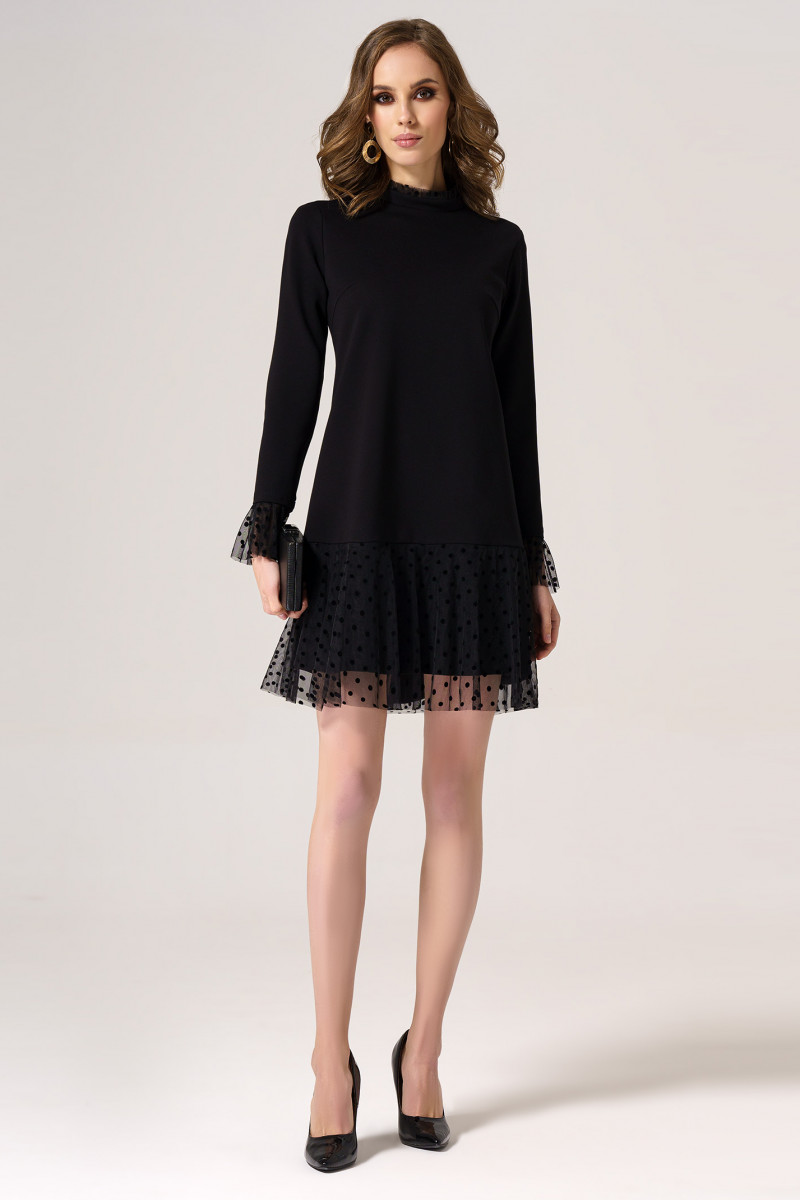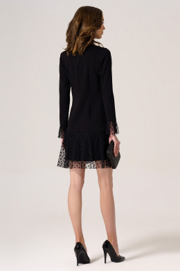 Маленькое черное платье говорит само за себя. Платье полуприлегающего силуэта, со стойкой от горловины, отрезное ниже линии бедер, в подрез вставлено декаративная сетка, нижняя деталь платья расширенная. Спинка с подрезом ниже линии бедер, от горловины петли пуговицы. Рукава длинные книзу, с декоративными манжнтами со складками. Вы уже - идеал для подражания, шикарный образ как по случаю так и без него. Легкость, романчтичность, очаровательность- это то, что объединяет обладательницу этого платья .