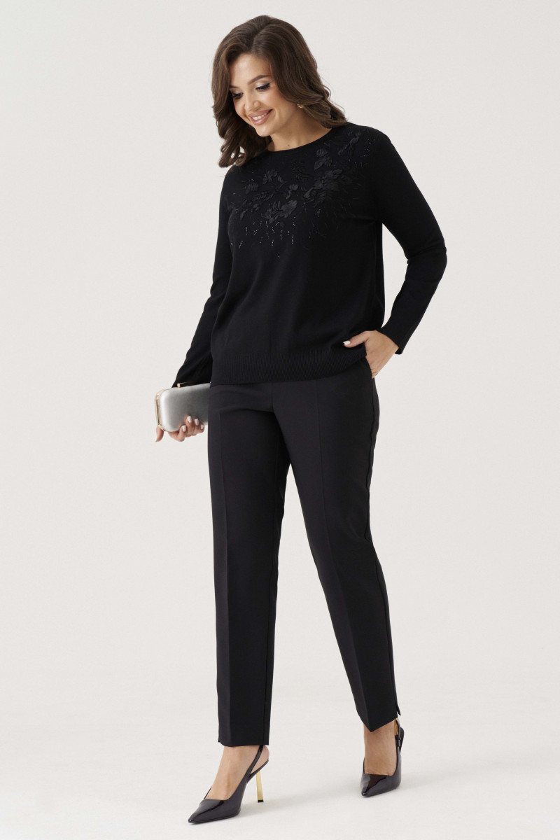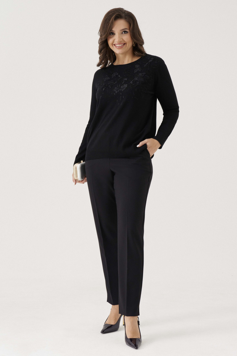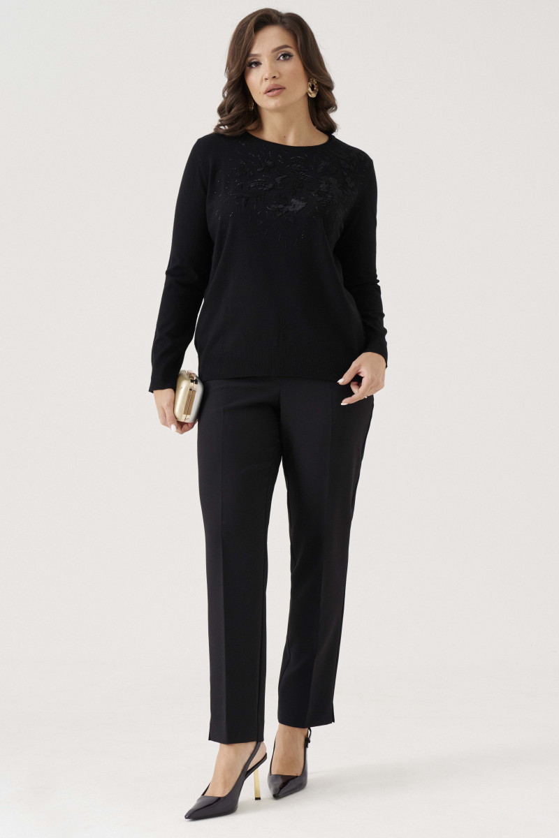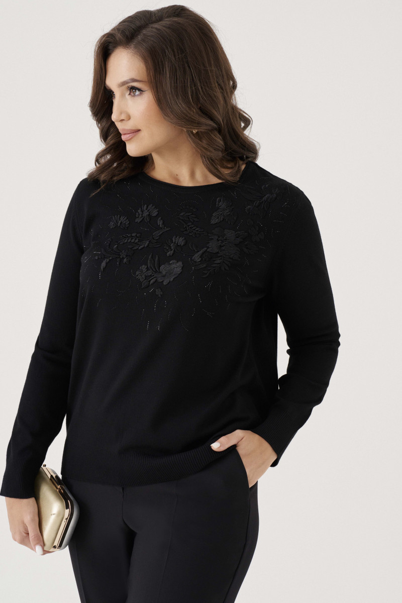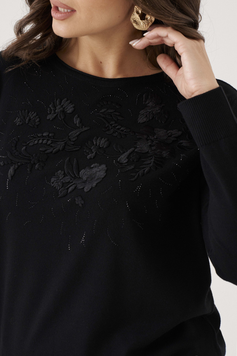 Джемпер женский вязаный из вискозной трикотажной пряжи прямого силуэта. Перед с декоративной вышивкой в виде цветов, украшенные стразами. Рукава втачные, низ рукава с довязом. Низ изделия с довязом. Очень удобный и практичный джемпер, который будет греть вас в прохладную погоду.