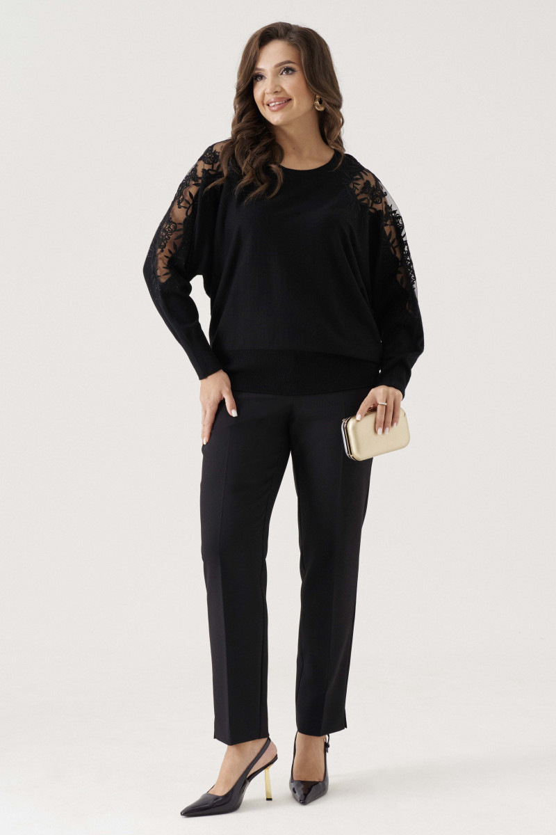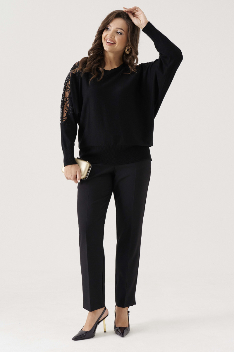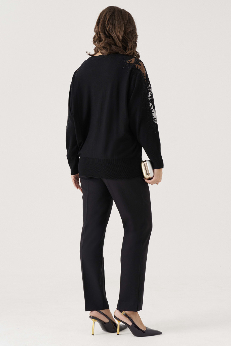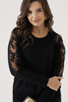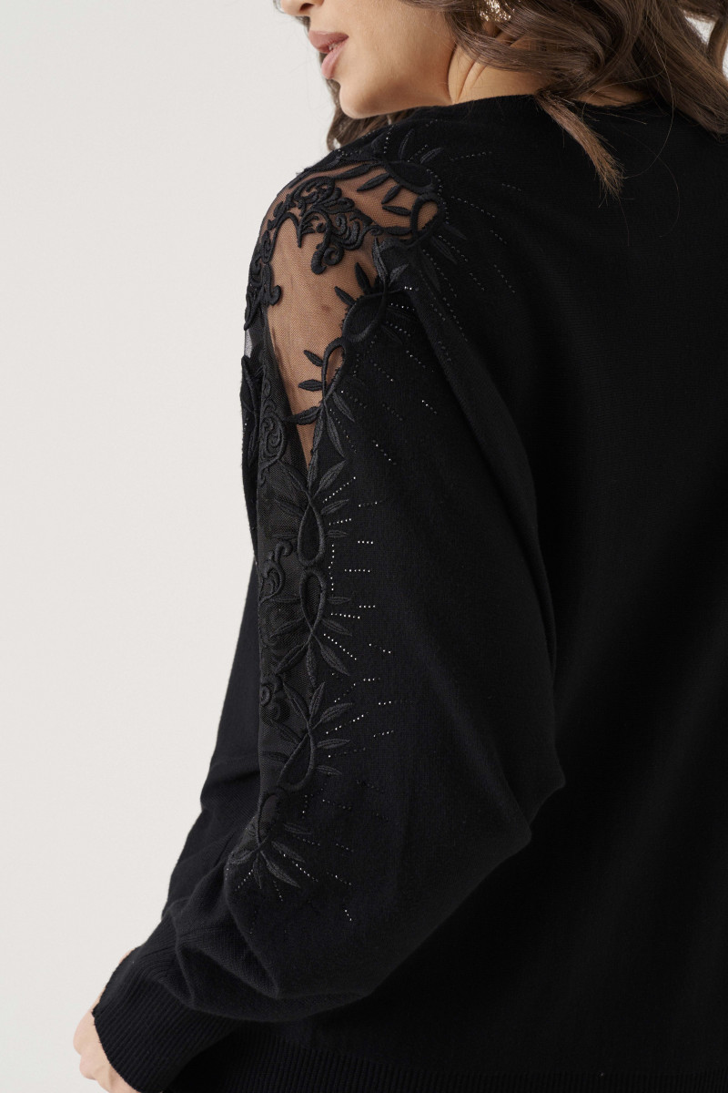 Джемпер женский вязаный из вискозной трикотажной пряжи прямого силуэта. Горловина обработана довязом. Рукава цельнокроеные с вышивкой и стразами, а также вставкой из сетки, низ рукава обработан довязом. Низ изделия с довязом. Очень удобный и практичный джемпер, который будет греть вас в прохладную погоду.