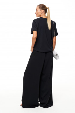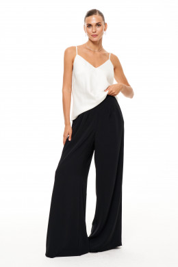 Брюки женские прямые из струящейся ткани для повседневной носки. Верхний срез брюк обработан притачным поясом со вставкой сзади в виде резинки для комфортного носко изделия. В брюках в боковом шве имеется застежка на одну петлю и одну пуговицу, а также имеется застежка на тесьму-молнию в боковом шве брюк. Передняя часть брюк имеет шесть талиевых вытачек. В брюках расположен в боковом шве потайной прорезной карман. Отличный классический вариант брюк, которые будут гармонично смотреться под любые изделия.