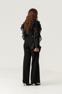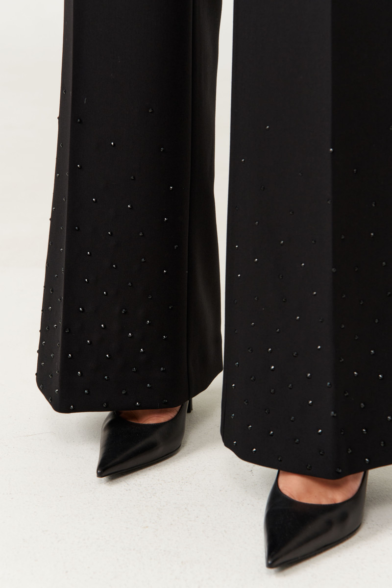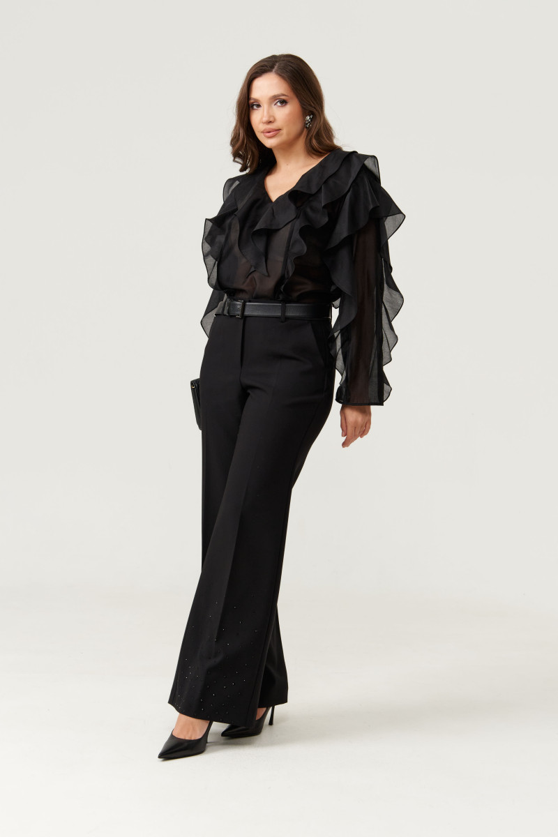 Брюки женские прямы из поливискозной ткани для повседневной носки. Верхний срез брюк обработан притачным поясом, застежка на одну петлю и одну пуговицу, а также застежка на тесьму-молнию в среднем шве брюк. В брюках имеются шлевки, что дает возможность носить их под ремень. Передняя часть брюк имеет декор в виде страз по низу изделия. Задняя часть брюк имеет две талиевые вытачки. В брюках расположен в боковом шве карман с подкройным бочком. Отличный классический вариант брюк, которые будут гармонично смотреться под любые изделия.