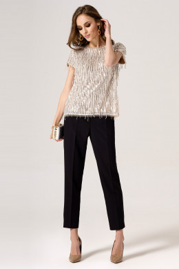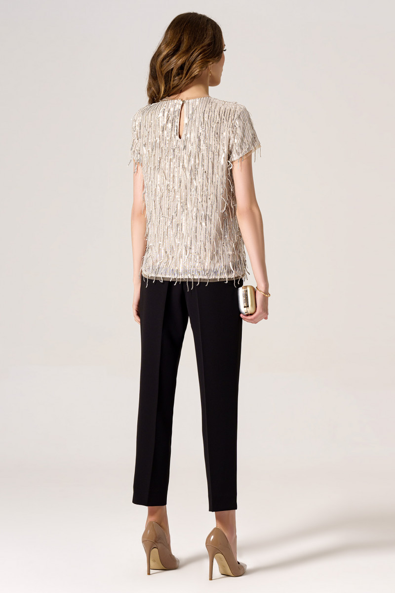 Нарядная блузка из пайеток. Блузка прямая, длиной до бедер, с короткими рукавами, с круглым вырезом горловины. Застежка на навесную петлю и пуговицу по спинке. Блузка на подкладки. Отличный эффектный вариант для любого торжественного мероприятия.