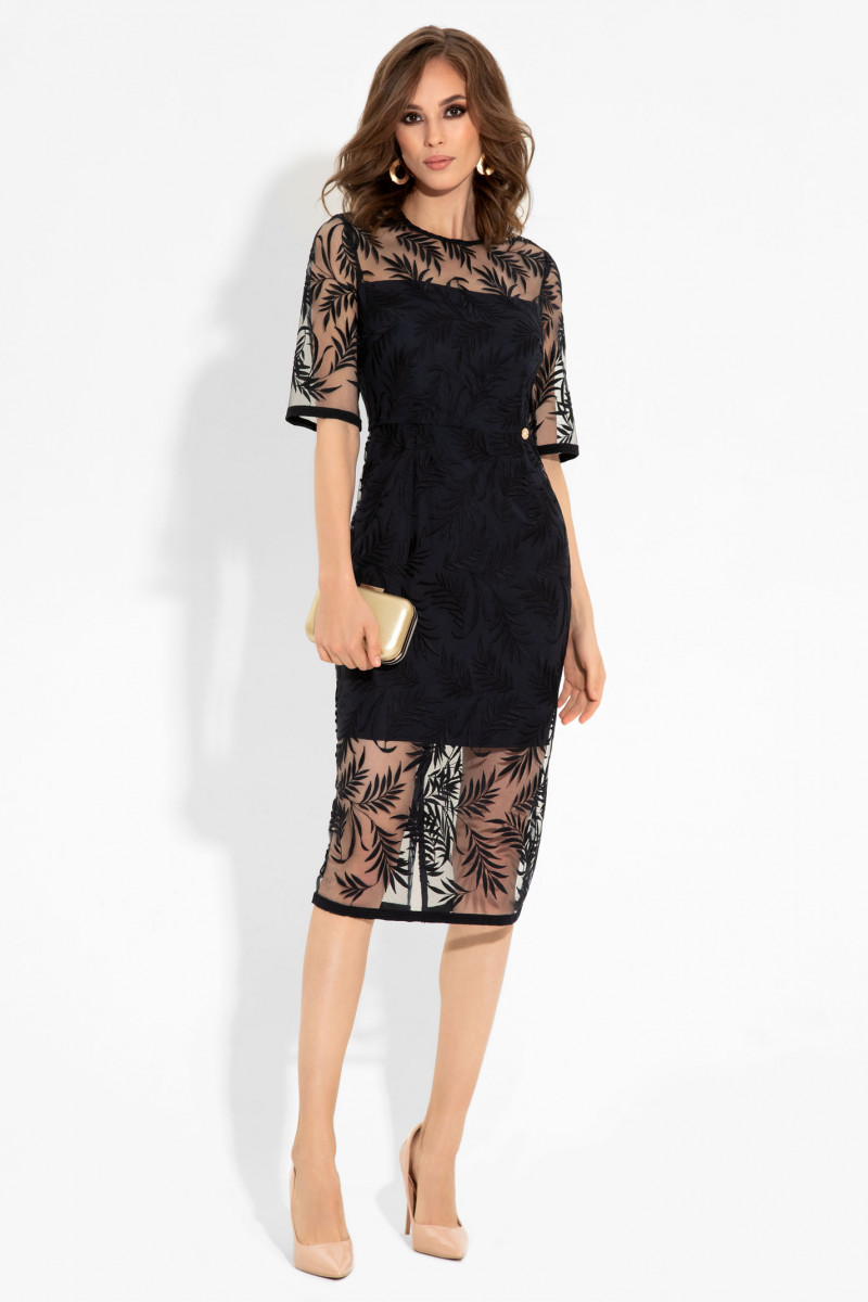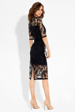 Нарядное платье из изящного кружева. Платье плотнооблегающее, длиной ниже коленей, с круглым вырезом горловины, с рукавами длиной до локтя, с застежкой на потайную тесьму-молнию по спинки. Платье отрезное по талии, по переду и по спинки вытачки, которые обеспечивают отличную посадку по фигуре. Такое платье отличный вариант для торжественных случаев.
