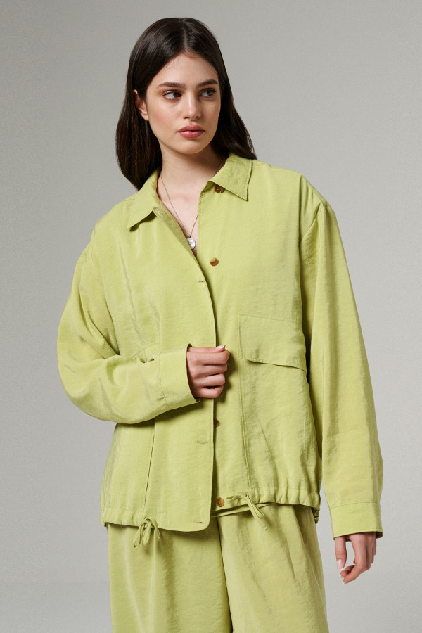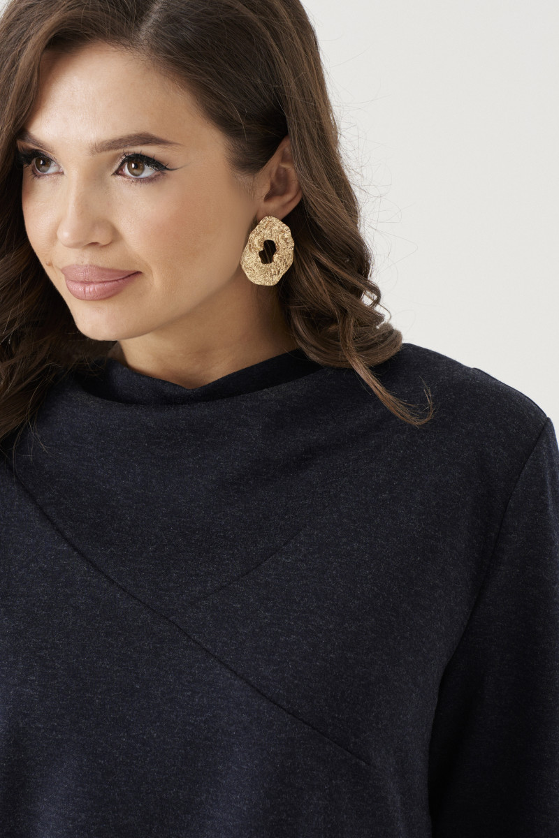 Джемпер прямого силуэта с втачными длинными рукавами с высокими отрезными двойными манжетами по низу. Воротник двойной мягкой формы ,оформлен в резы фигурной вормы,выполненные по переду и спинке