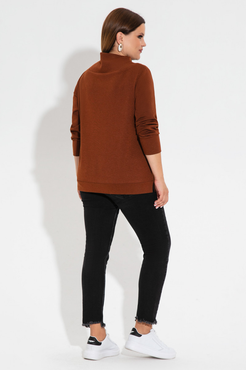 Джемпер прямого силуэта с втачными длинными рукавами с высокими отрезными двойными манжетами по низу. Воротник двойной ,мягкой формы ,оформлен в резы фигурной формы,выполненные по переду и спинке.Практичный и эффектный джемпер непременно станет любимой вещью гардероба дла девушки,которая ценит в одежде элегантность,сдержанность и комфорт.