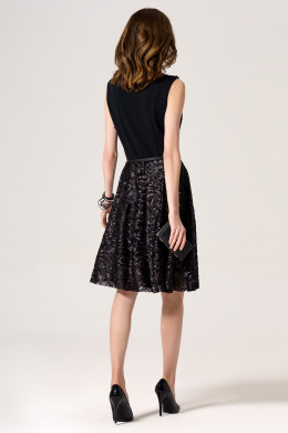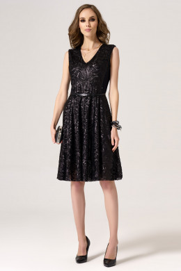 Стильное и эффектное молодёжное платье для торжественных случаев. Х-образный силуэт, V-образный вырез горловины,декорированный кожанным кантом,изящный тонкий кожанный пояс на талии, мерцающие нарядные пайетки ,образующие эффектные узоры- всё это помогает создать девушке яркий и остромодный образ ,не жертвуя комфортом. Спинка и отрезные бочки переда выполнены из мягкого плотного трикотажа. Платье отрезное по талии. Юбка расклешена конически.