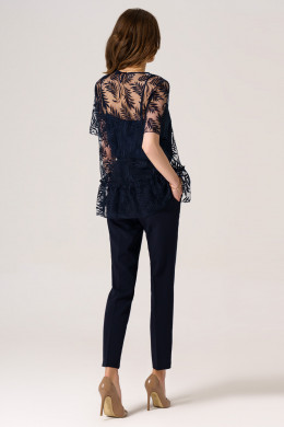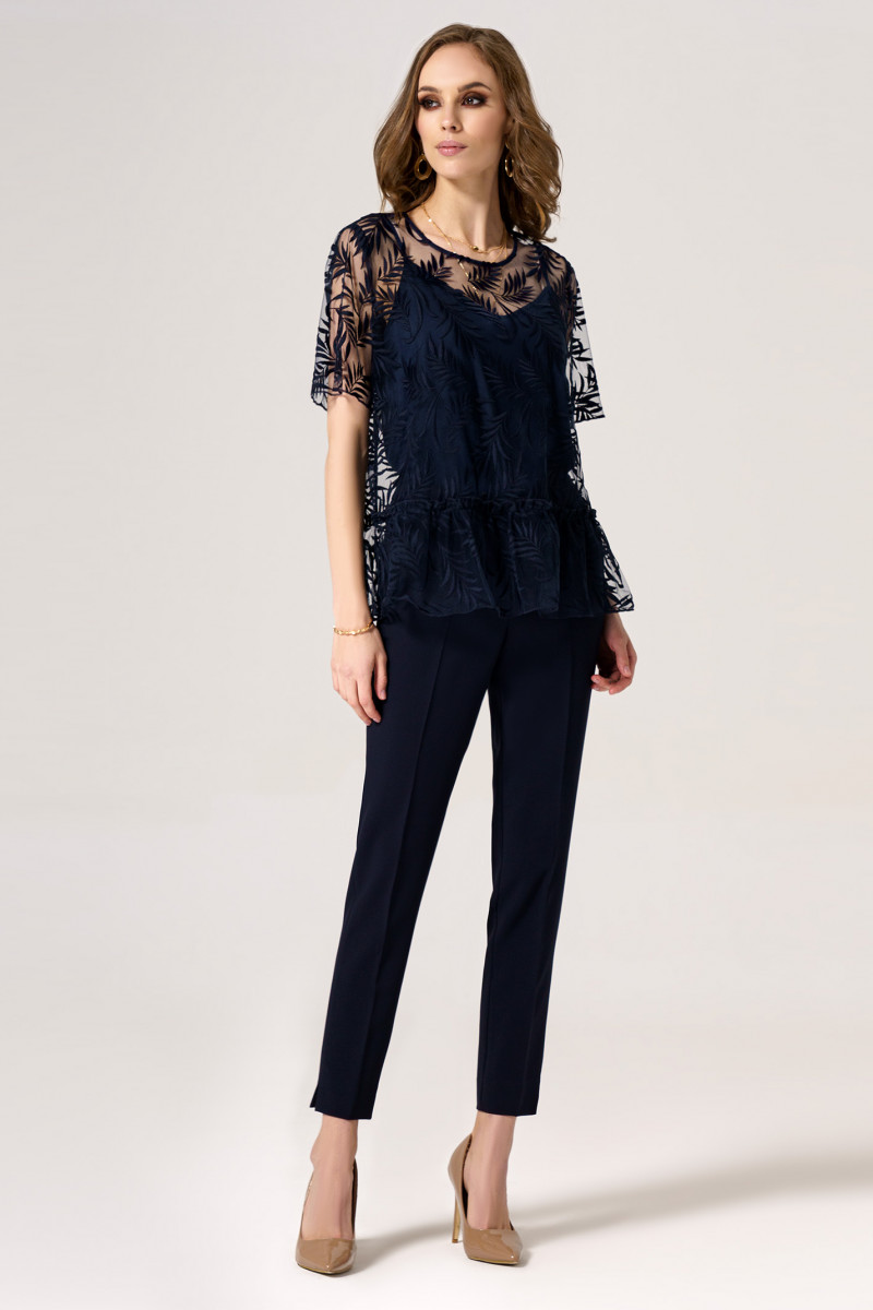 Нарядный комплект ( топ,блузка) смотрится очень нежно .Нарядная сетка с вышивкой выглядит на фигуре таинственно и романтично. Блузка с круглым вырезом горловины и застёжкой на петлю-пуговицу сзади имеет втачной рукав. По низу притачена широкая баска со сборкой и нежной рюшей по верху. Блузка по спинке удлинена. Нижний топ на бретелях вполнен из вискозы.Спереди верхний срез топа имеет прогиб.По спинке спина частично открыта.Центральная часть спинки по верхнему срезу присборена на резинку.Длина бретелей регулируется. Комплект выглядит невесомо и женственно. Прекрасный вариант нарядной блузки как для торжественного случая,так и на каждый день для стильной и активной девушки.