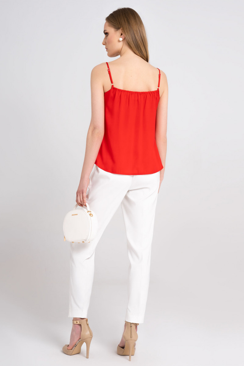 Молодежный нарядный топ из легкой струящейся ткани. Топ прямого силуэта на бретелях. Бретели с регуляторами. По спинки резинка. По переду топ дополнен воланом, который придает нарядность данной модели. Такой топ отлично подойдет под любой жакет для офиса или просто с любимыми джинсами в жаркие летние дни.