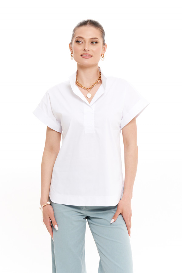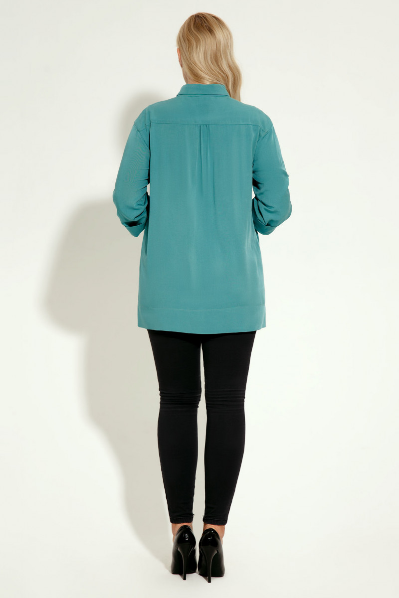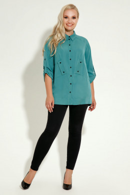 Восхитительная повседневная блузка выполнена из мягкой,чуть эластичной , вискозной ткани. Рукав длиной ниже локтя ,рубашечный с манжетом,подвёрнутым снизу и зафиксированным на пату с петлёй и пуговицей. По переду выполнена отрезная кокетка , декоративные резы и детали в виде клапанов ,придающие блузке споортивность и эффектность . Застёжка спереди на отрезную планку с петлями и пуговицами. Клапаны также фиксируются с помощью декоративных пуговиц. По спинке выполнена отрезная кокетка и сборка,обеспечивающая свободу движений. Снизу по бокам выполнены разрезы. Спинка длиннее переда.Прекрасный вариант блузки на каждый день для эффектной девушки,ценящей в одежде комфорт и стиль .