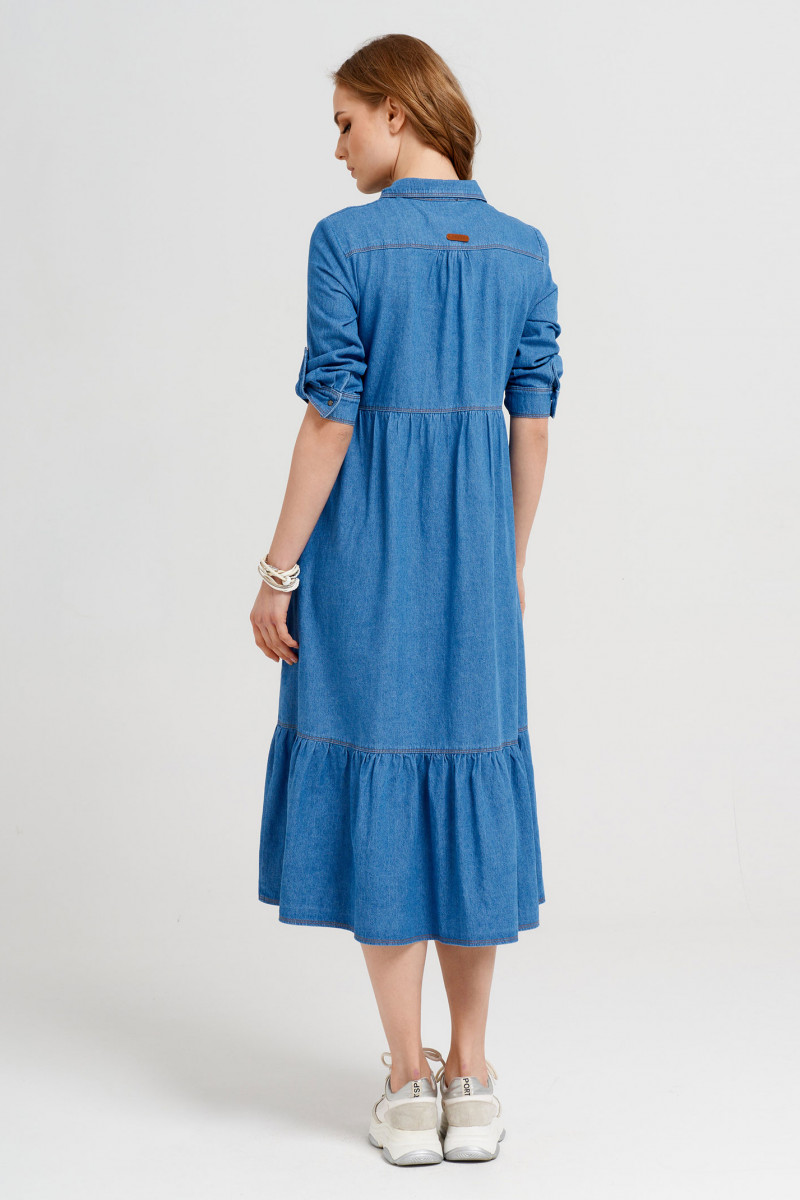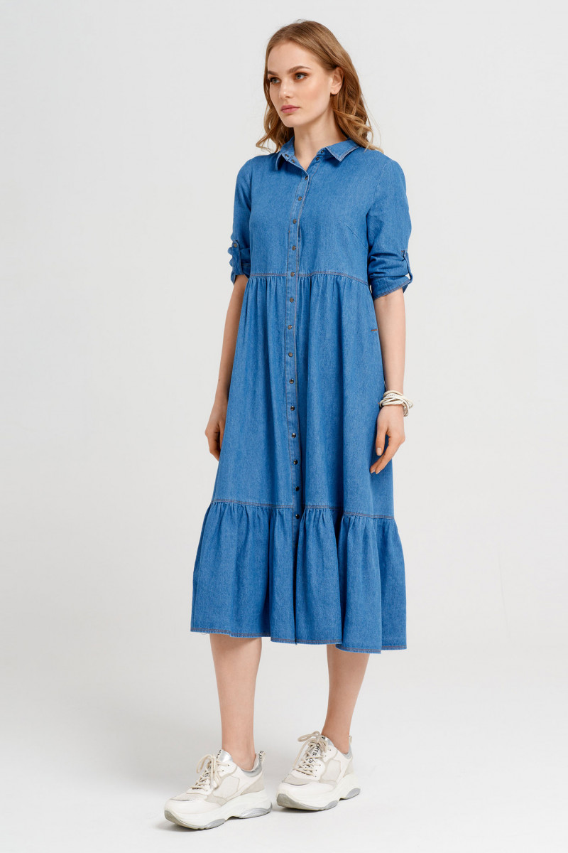 Модное молодежное платье из джинсовой хлопковой ткани. Платье расширенного силуэта, с центральной сквозной застежкой на кнопки. Платье длиной "миди" с декоративными подрезами и сборкой. Рукава длиной ниже локтя с декоративной патой. Воротник рубашечный. В боковых швах имеются карманы. Очень стильный комфортный вариант для повседневной носки.
