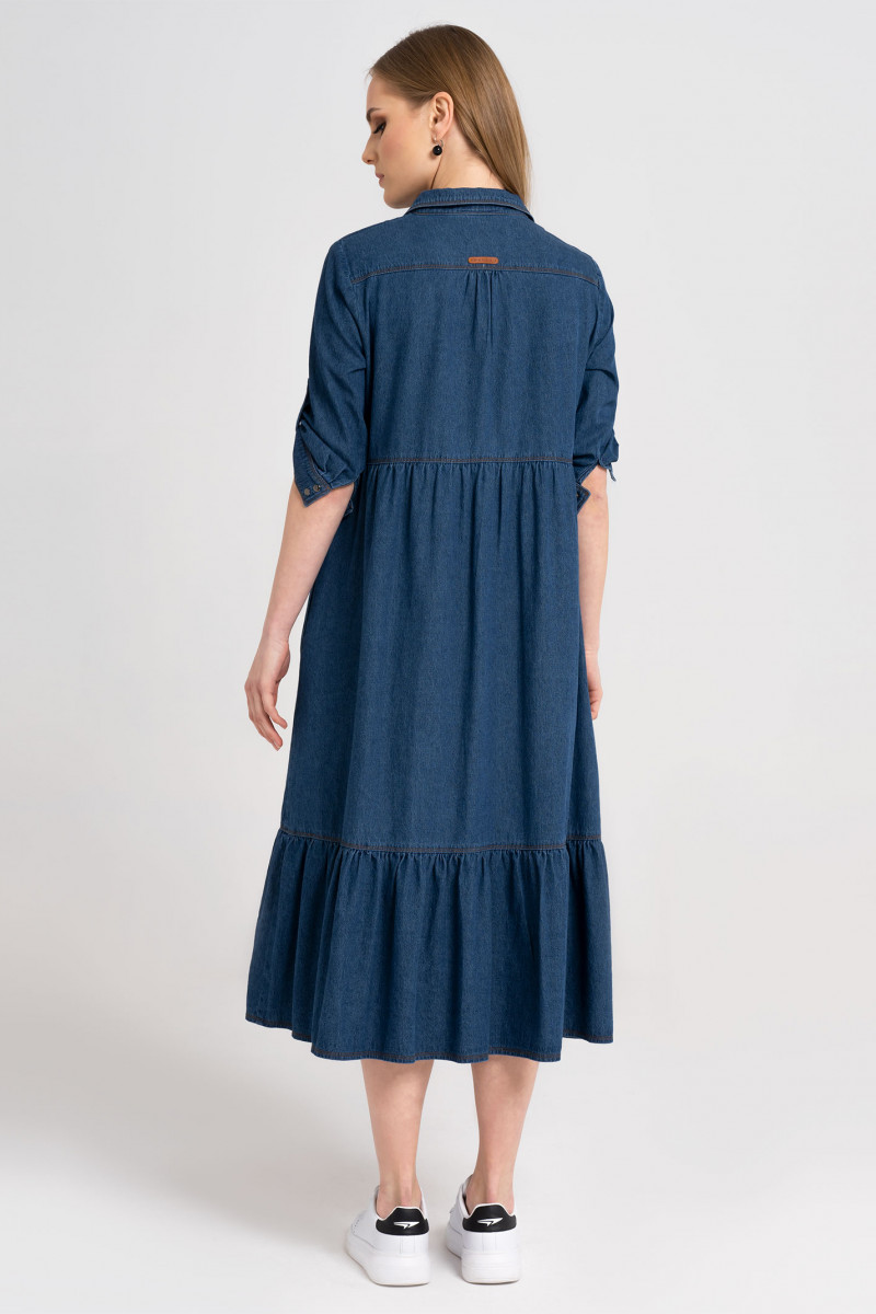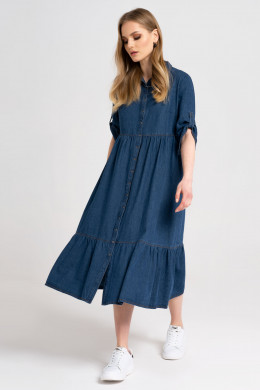 Модное молодежное платье из джинсовой хлопковой ткани. Платье расширенного силуэта, с центральной сквозной застежкой на кнопки. Платье длиной "миди" с декоративными подрезами и сборкой. Рукава длиной ниже локтя с декоративной патой. Воротник рубашечный. В боковых швах имеются карманы. Очень стильный комфортный вариант для повседневной носки.