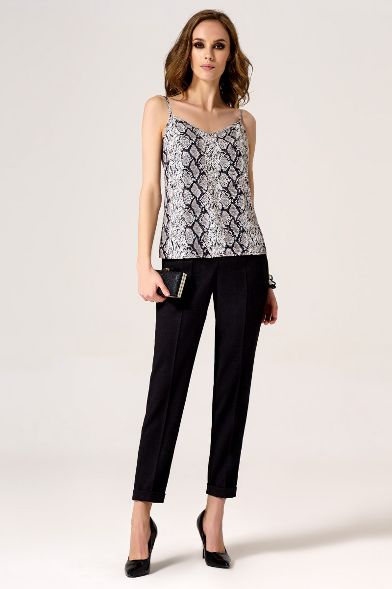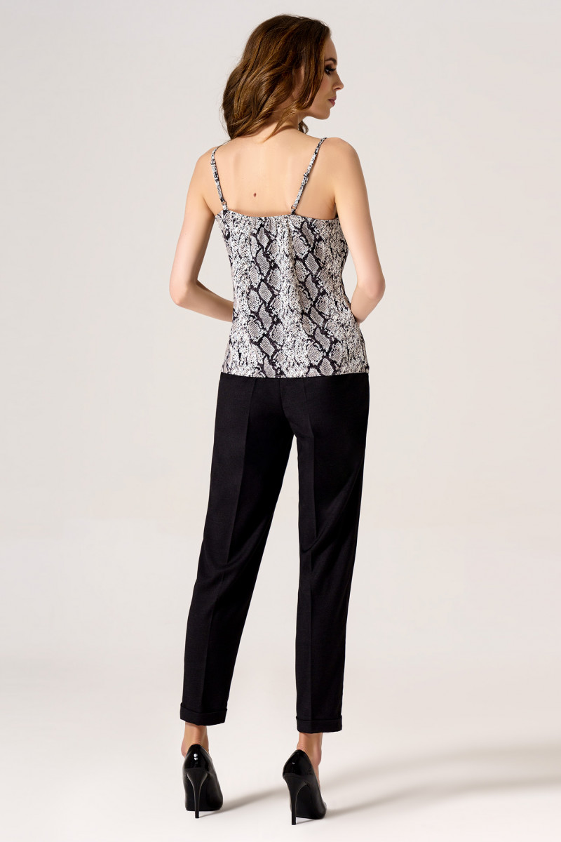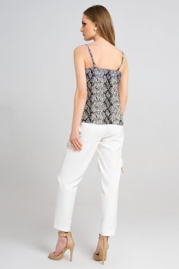 Тонкий и изящный топ на бретелях с графичным эффектным принтом,имитирующим кожу змеи. Топ прямого силуэта с мягким вырезом треуголной формы спереди и открытой верхней частью спинки сзади.По верхнему срезу спинка присборена на резинку. Длина бретелей регулируется. Топ очень эффектно смотрится с жакетом и брюками, как вариант для офиса. Также можно составить стильный летний лук с топом и однотонной юбкой.