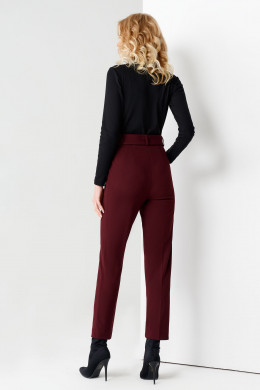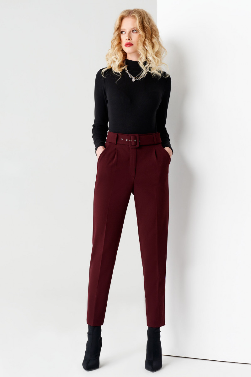 Зауженные женские брюки застегиваются на замок-молнию, скрытый гульфиком и пуговицу. В шлевки продет пояс с пряжкой, обтянутой основной тканью.