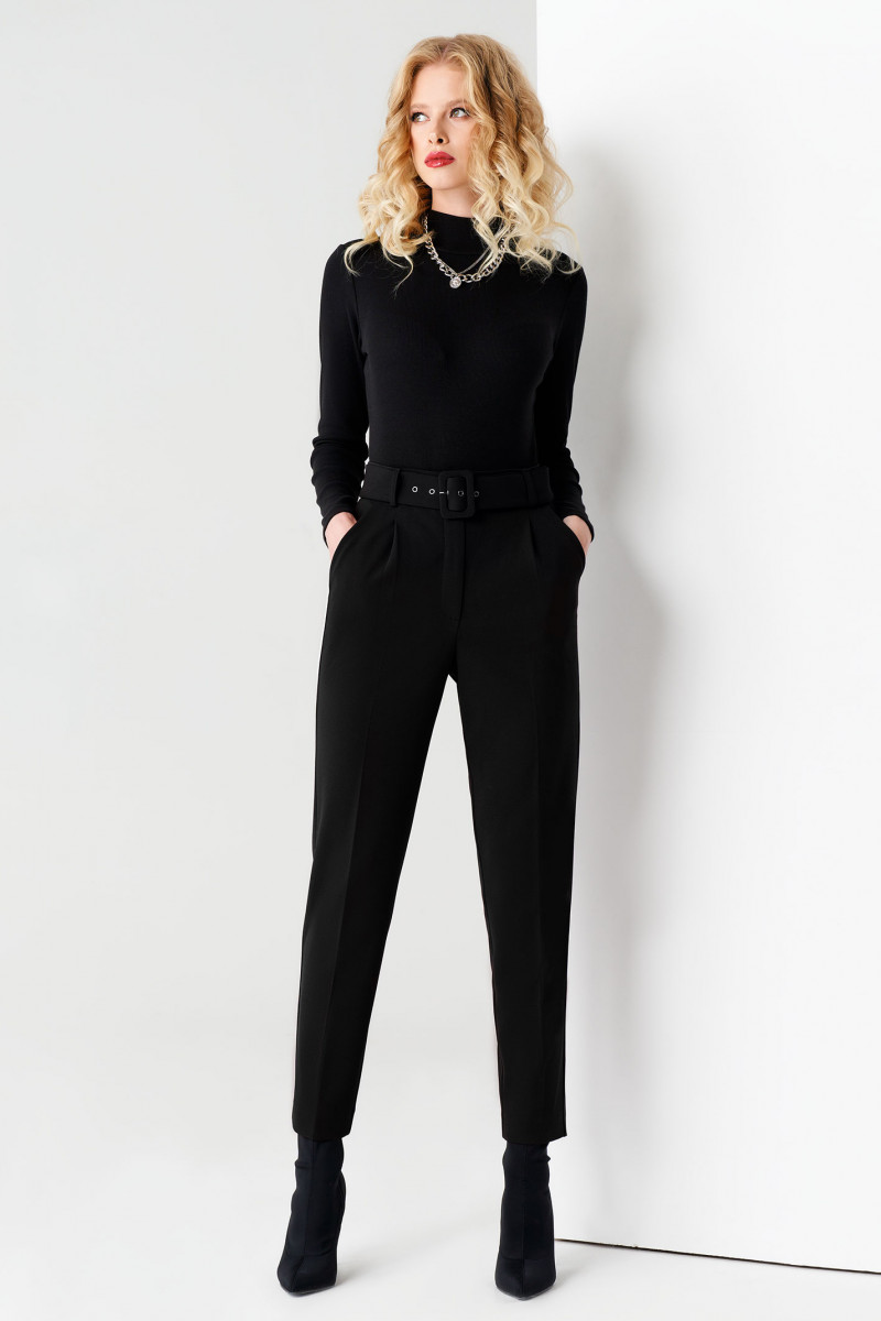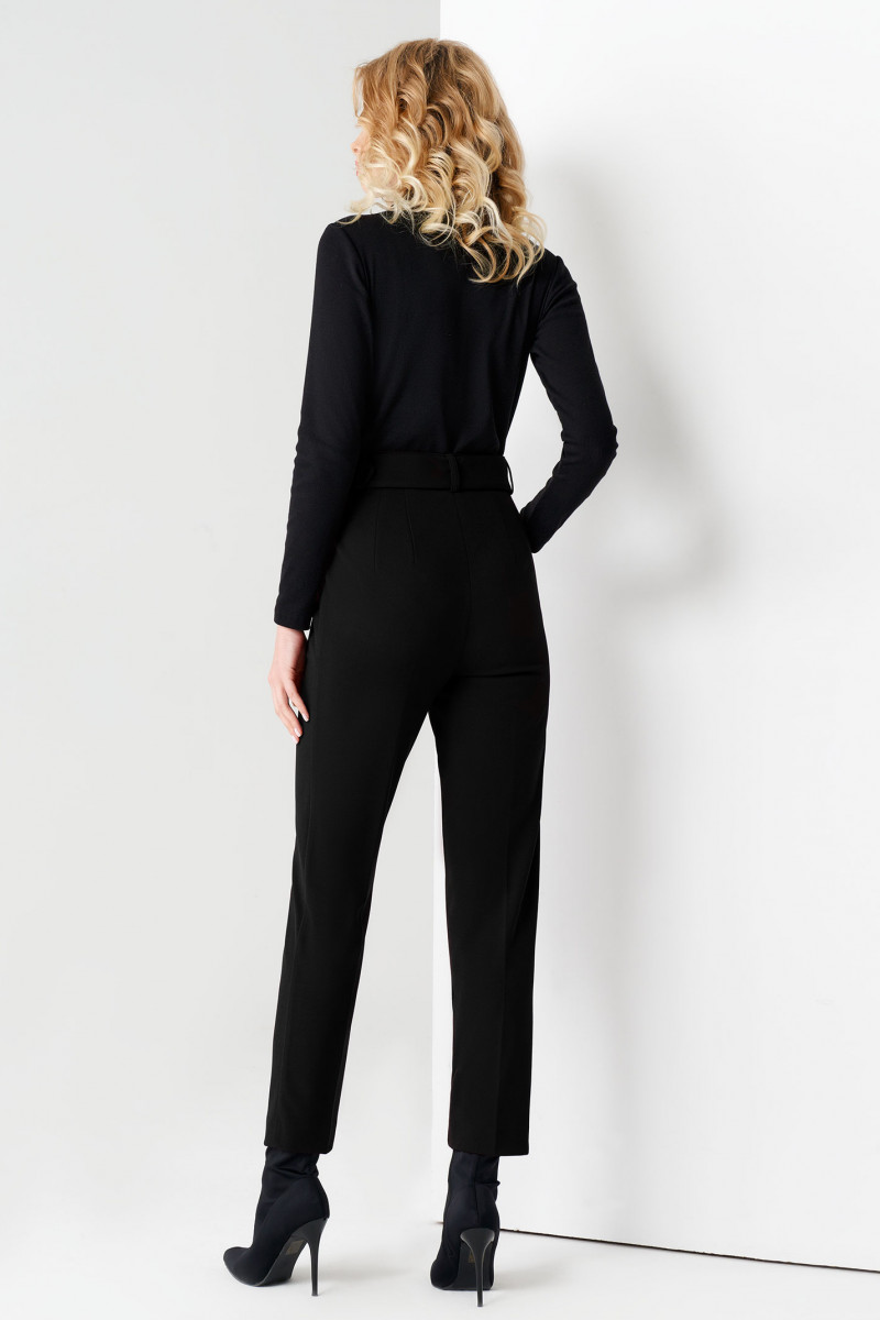 Зауженные женские брюки застегиваются на замок-молнию, скрытый гульфиком и пуговицу. В шлевки продет пояс с пряжкой, обтянутой основной тканью.