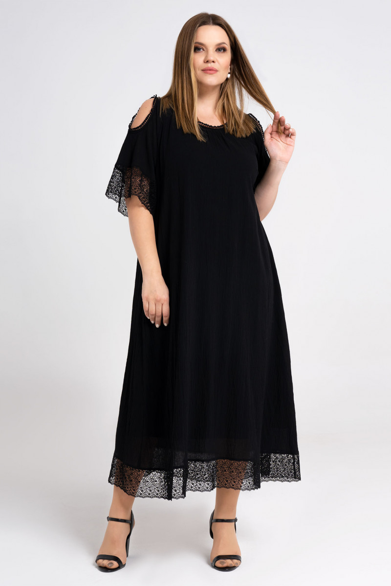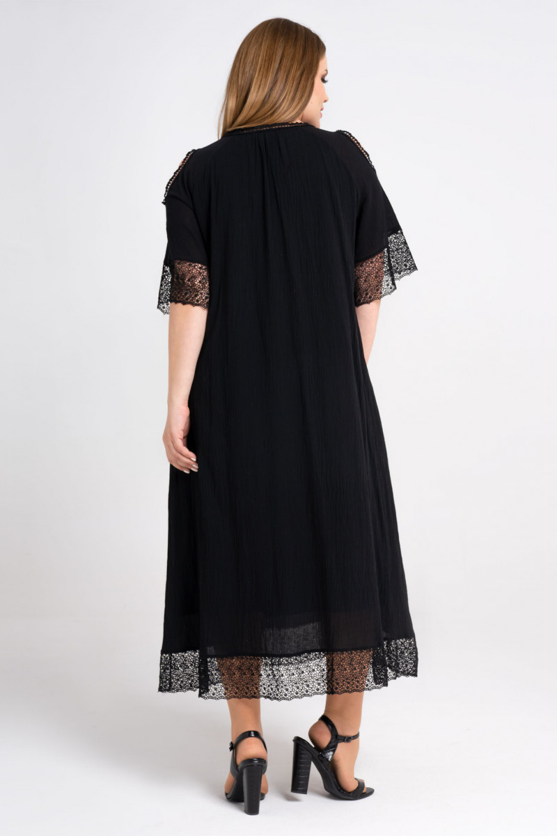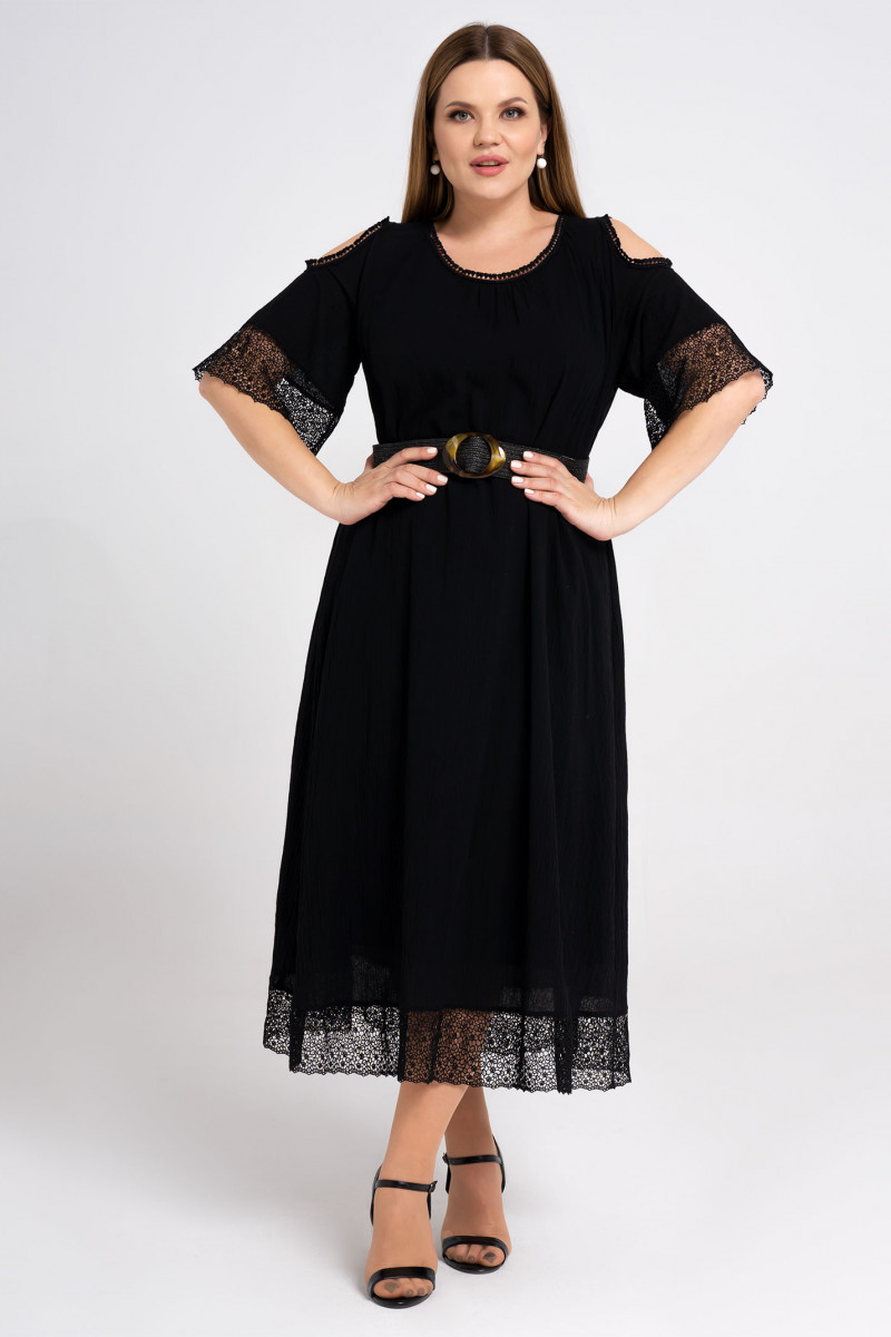 Стильное модное платье из тонкой хлопковой ткани. Платье трапециевидного силуэта, длиной миди. Платье с круглым вырезом горловины, с рукавами кроя реглан. На рукавах имеются декоративные вырезы. Платье по низу рукавов и по низу изделия декорировано широким хлопковым кружевом, а по горловине и по декоративным вырезам на рукавах декорировано тонким хлопковым кружевом. Дополнено платье широким съёмным поясом, который легко подчеркивает талию. Отличный вариант как для летнего отдыха, так и для светского мероприятия в жаркие летние дни.