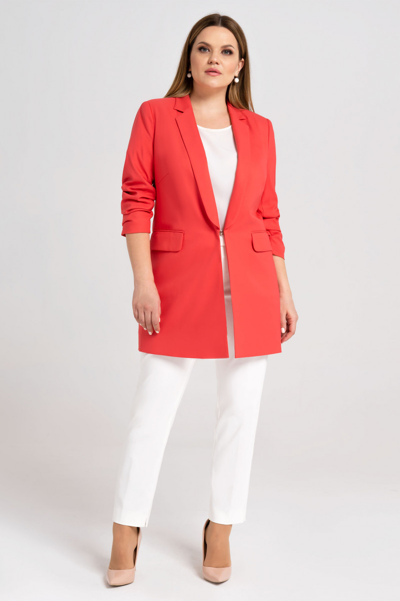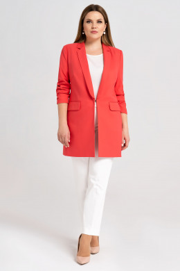 Стильный удлиненный жакет с укороченными рукавами с застежкой на потайной крючок по переду. Жакет с воротником и лацканами, застежка встык. По бокам рельефы, по переду от рельефа имеется нагрудная выточка, все это обеспечивает отличную посадку по фигуре. По бокам карманы с клапаном в рамку. Жакет на вискозной подкладки. Такой жакет отлично сочетается как с брюками, так и отлично подойдет в комплекте к платью.