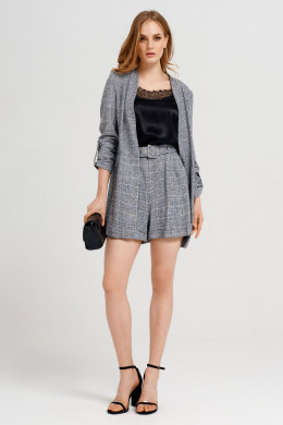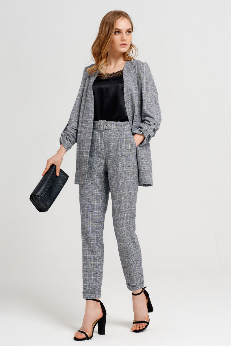 Стильный жакет из льняной ткани с рисунком в клетку. Жакет полуприлегающего силуэта, без застежки, с отрезными бочками, с длинными рукавами. По рукавам имеется декоративная пата. По переду карманы в рамку с клапаном. Жакет без подкладки. Такой жакет идеальный вариант для офиса в жаркие летние дни.