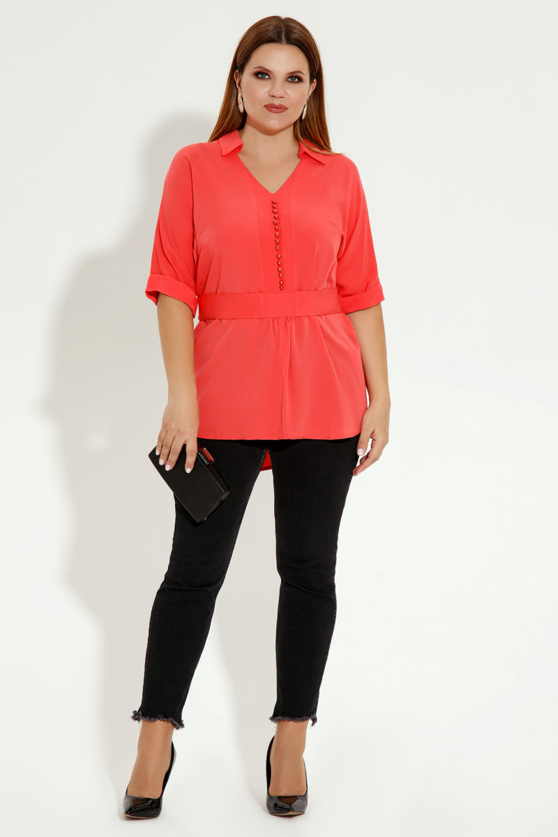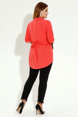 Очень женственная и изящная блузка из мягкого и чуть эластичного вискозного полотна. Силуэт блузки X-образный. Вырез горловины V-образный с отложным воротником на стойке. Рукава цельнокроеные с отложной манжетой по низу. Спереди оформлена имитация застёжки на ряд декоративных пуговиц и зафиксирован отлетной пояс из основной ткани,завязывающийся сзади на бант. Спереди по центру от талии вниз оформлена сборка. Низ блузки фигурной формы- короче по бокам и длиннее по спинке. Прекрасный вариант как на каждый день ,так и для торжественного случая для элегантной и яркой девушки.