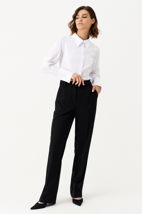 Классический шик, блузка прямого силуэта, с нагрудными вертикально расположенными вытачками, идущими от плечевого шва, с центральной застежкой на петли пуговицы, воротник отложной со стойкой, с боковыми отрезными деталями и пуговицами, спинка дленее переда, рукава длиные. Хороший вариант как для офиса, так и для выхода в свет.