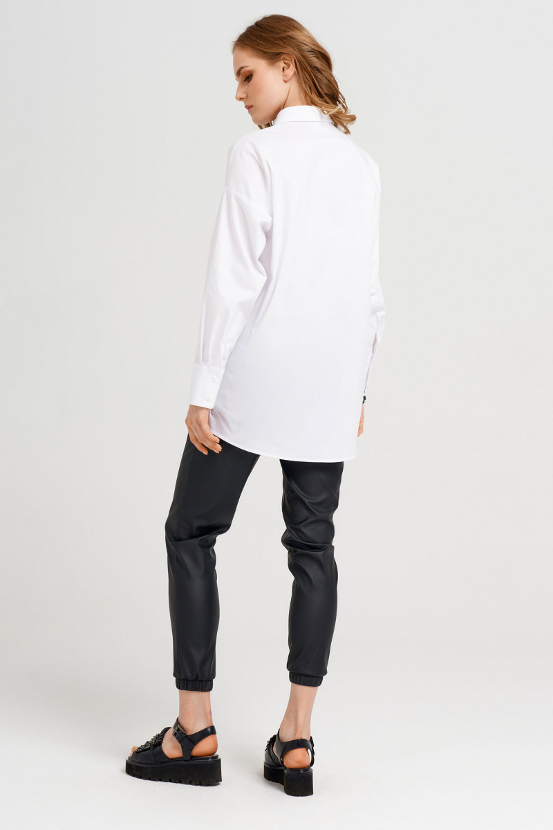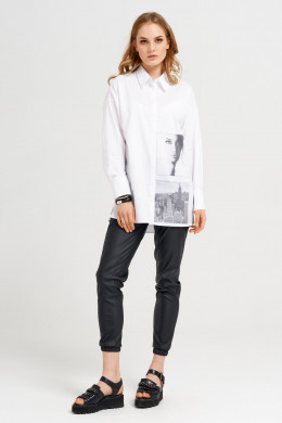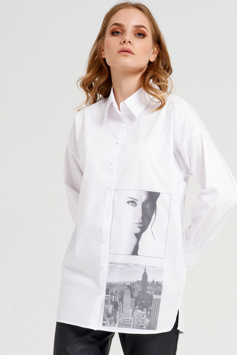Блузка женская прямого силуэта, немного расширенного кверху. Рукав сорочечный,свободный.Снизу на широком манжете с двумя петлями-пуговицами. Воротник рубашечный отложной на стойке. По переду выполнен стильный графичный фото-принт . Застёжка спереди на петли-пуговицы на центральной планке.В боковых швах снизу выполнены разрезы. Спинка по низу с прогибом. Приятная к телу и удобная в носке блузка наверняка порадует стильную и энергичную девушку,
