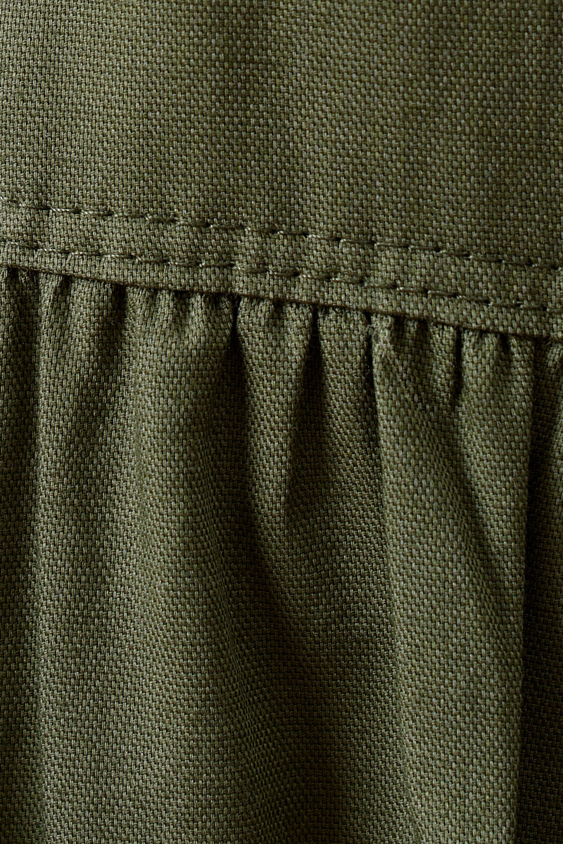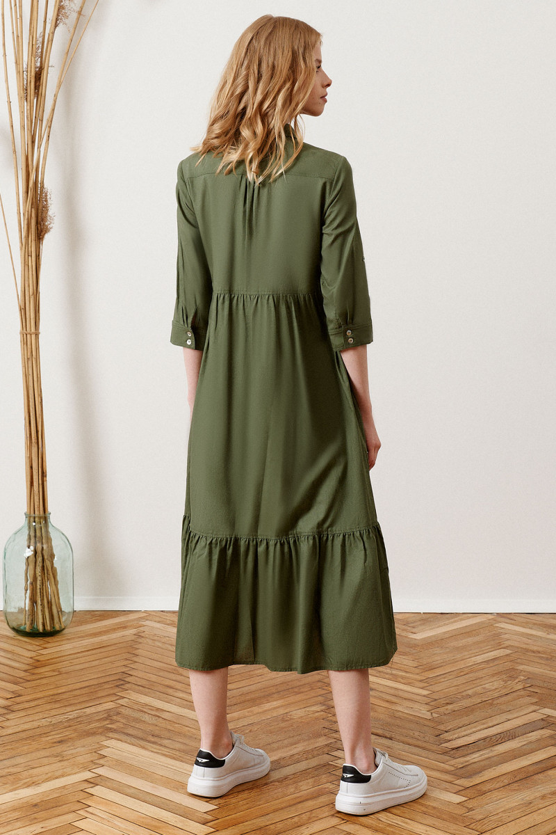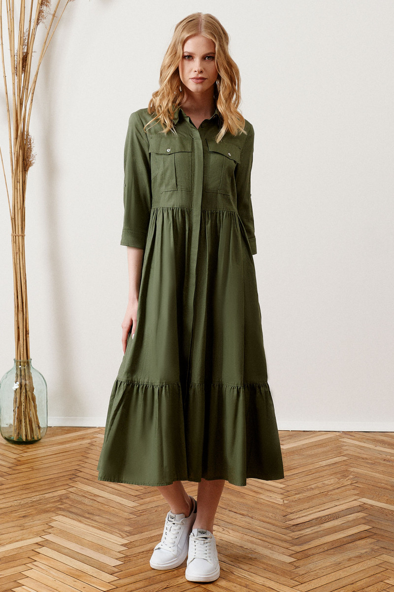 Модное молодежное платье из хлопковой ткани. Платье расширенного силуэта, с центральной сквозной застежкой на петли и пуговицы. Платье длиной "миди" с декоративными подрезами и сборкой. Рукава длиной ниже локтя с декоративной патой. Воротник рубашечный. В боковых швах имеются карманы. По переду на груди имеются накладные большие карманы с клапанами. Очень стильный комфортный вариант для повседневной носки.