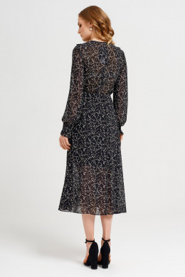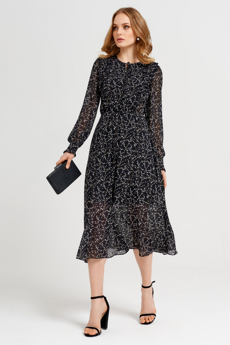 Нарядное платье из шифона в нежный принт. Платье длиной "миди", без воротника, с овальным вырезом горловины. По переду вырез «капелька», с завязками. По переду в рельеф пройму и отрезной бочок вставлена рюша. Рукав длинный, с манжетой. По нижнему срезу манжеты рюша. Платье отрезное по линии талии, со сборкой на резинку. Застежка на потайную молнию в боковом шве.