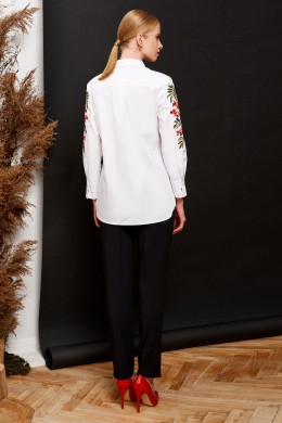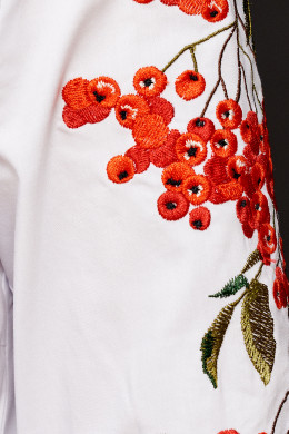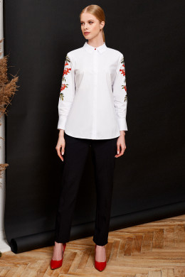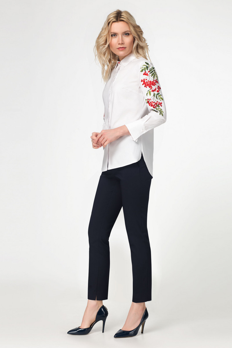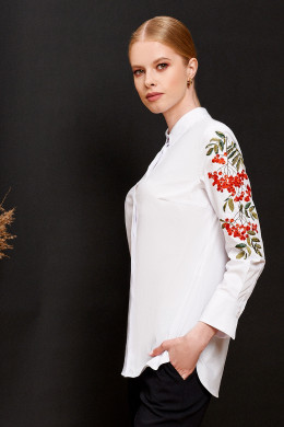 Блузка с вышивкой белая придаст вашему образу женственность и нежность. Даже в каждодневной суете в ней вы будете ощущать себя элегантной и романтичной натурой. Нарядная блузка подойдет даже под деловой образ со строгими классическими брюками или прямой юбкой. Наденьте ее с любимыми джинсами - и получите эффектный повседневный аутфит. Белая блузка полуприлегающего кроя визуально стройнит фигуру.Белая рубашка украшена гроздьями рябины, вышитыми на длинных рукавах с манжетами. Декор не кажется навязчивым, а придает модели утонченность.Низ изделия - асимметричный, скругленный, с разрезами в боковых швах. Застежка скрыта в потайной центральной планке. Рубашечный воротник украшает пуговица красного цвета.Блузка с вышивкой женская изготовлена из хлопковой ткани с мягкой, гладкой поверхностью. Материал не сминается, не парит, за ним легко ухаживать - стирать и гладить.Вы можете купить рубашку с вышивкой женскую для своего базового осенне-весеннего гардероба.
