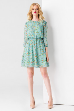 Нарядное платье из шифона в нежный принт. Платье без воротника, с овальным вырезом горловины. Рукав 3/ 4, расширенный, по нижнему срезу собран на резинку. Платье отрезное по линии талии, со сборкой на резинку. Перед и юбка на подкладке.