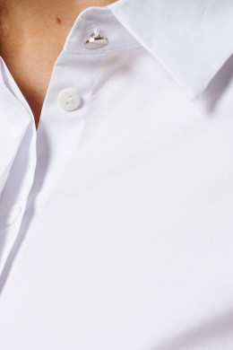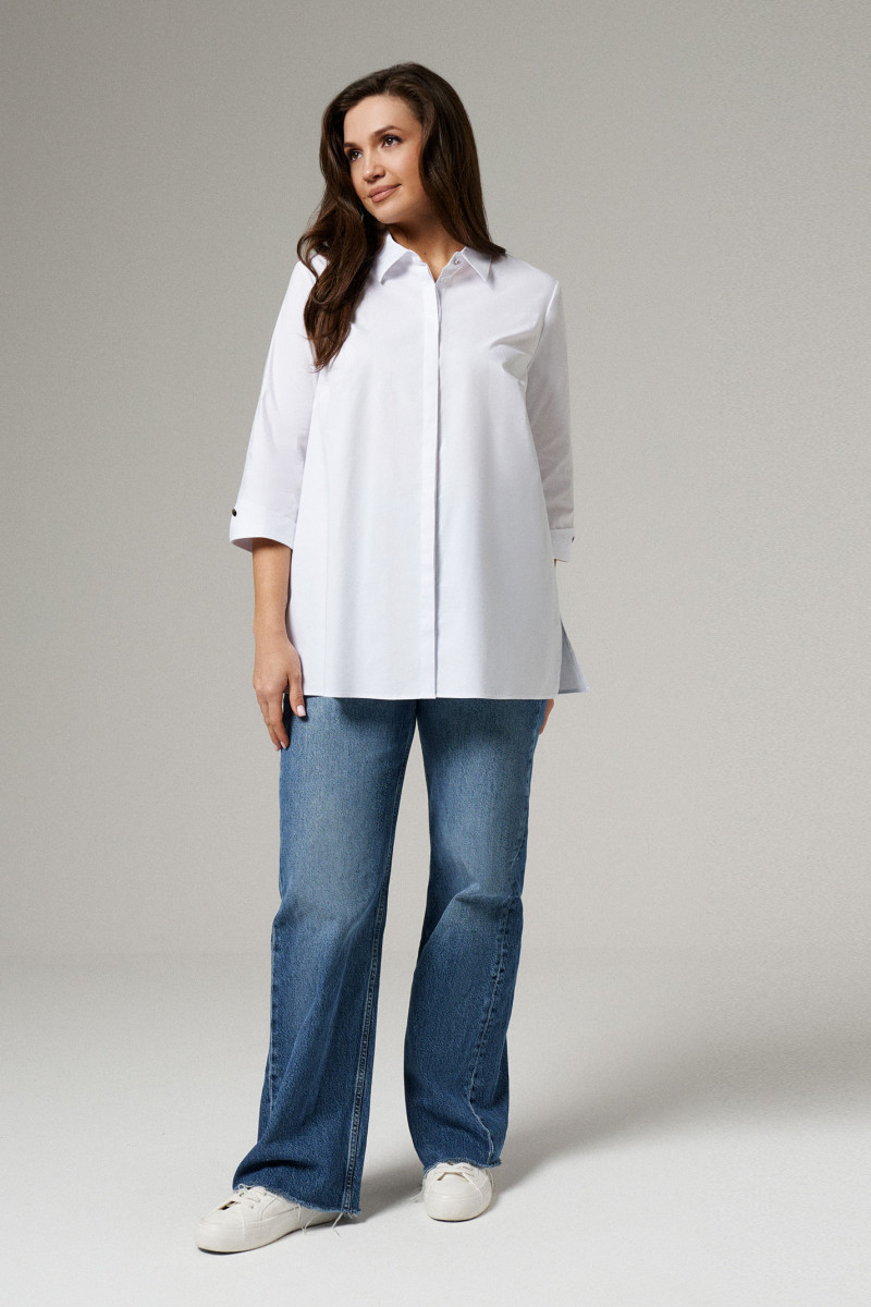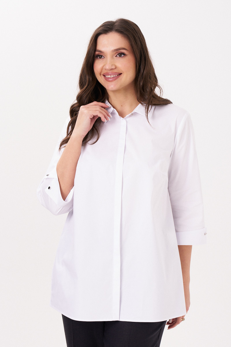Неизменная классика - блузка белая женская рубашечного кроя, универсальная в носке. Ее можно надеть не только на работу в офис или на учебу, но и на официальные мероприятия. Лаконичный дизайн придаст повседневным образам более строгий вид.Блузка женская с длинным рукавом больших размеров изготовлена из хлопковой ткани с полиэстером и эластаном. Рукав 7/8 с отложными манжетами украшен декоративными пуговицами и петлями. Рубашка женская белая дополнена отложным воротником сорочечного типа. Застегивается на потайные пуговицы и петли, скрытые под центральной планкой.Блузка-рубашка женская с притачной к спинке кокеткой, которая позволяет добиться идеальной посадки. В центре спинки несколько вытачек, благодаря чему ткань не топорщится. Полуприлегающий фасон формирует изящный силуэт, скрывая недостатки. Благодаря большому содержанию хлопка, рубашка хорошо пропускает воздух. Женская блузка нарядная пригодится для повседневной носки, ее можно купить для любого сезона.