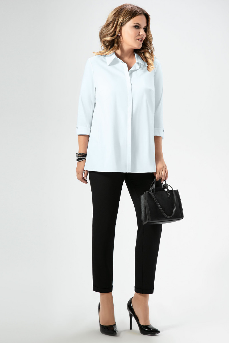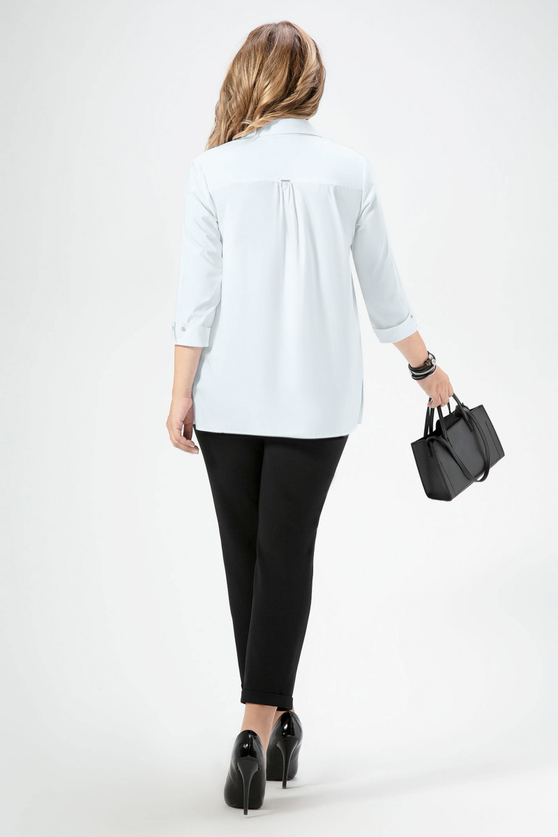 Неизменная классика - блузка белая женская рубашечного кроя, универсальная в носке. Ее можно надеть не только на работу в офис или на учебу, но и на официальные мероприятия. Лаконичный дизайн придаст повседневным образам более строгий вид.Блузка женская с длинным рукавом больших размеров изготовлена из хлопковой ткани с полиэстером и эластаном. Рукав 7/8 с отложными манжетами украшен декоративными пуговицами и петлями. Рубашка женская белая дополнена отложным воротником сорочечного типа. Застегивается на потайные пуговицы и петли, скрытые под центральной планкой.Блузка-рубашка женская с притачной к спинке кокеткой, которая позволяет добиться идеальной посадки. В центре спинки несколько вытачек, благодаря чему ткань не топорщится. Полуприлегающий фасон формирует изящный силуэт, скрывая недостатки. Благодаря большому содержанию хлопка, рубашка хорошо пропускает воздух. Женская блузка нарядная пригодится для повседневной носки, ее можно купить для любого сезона.