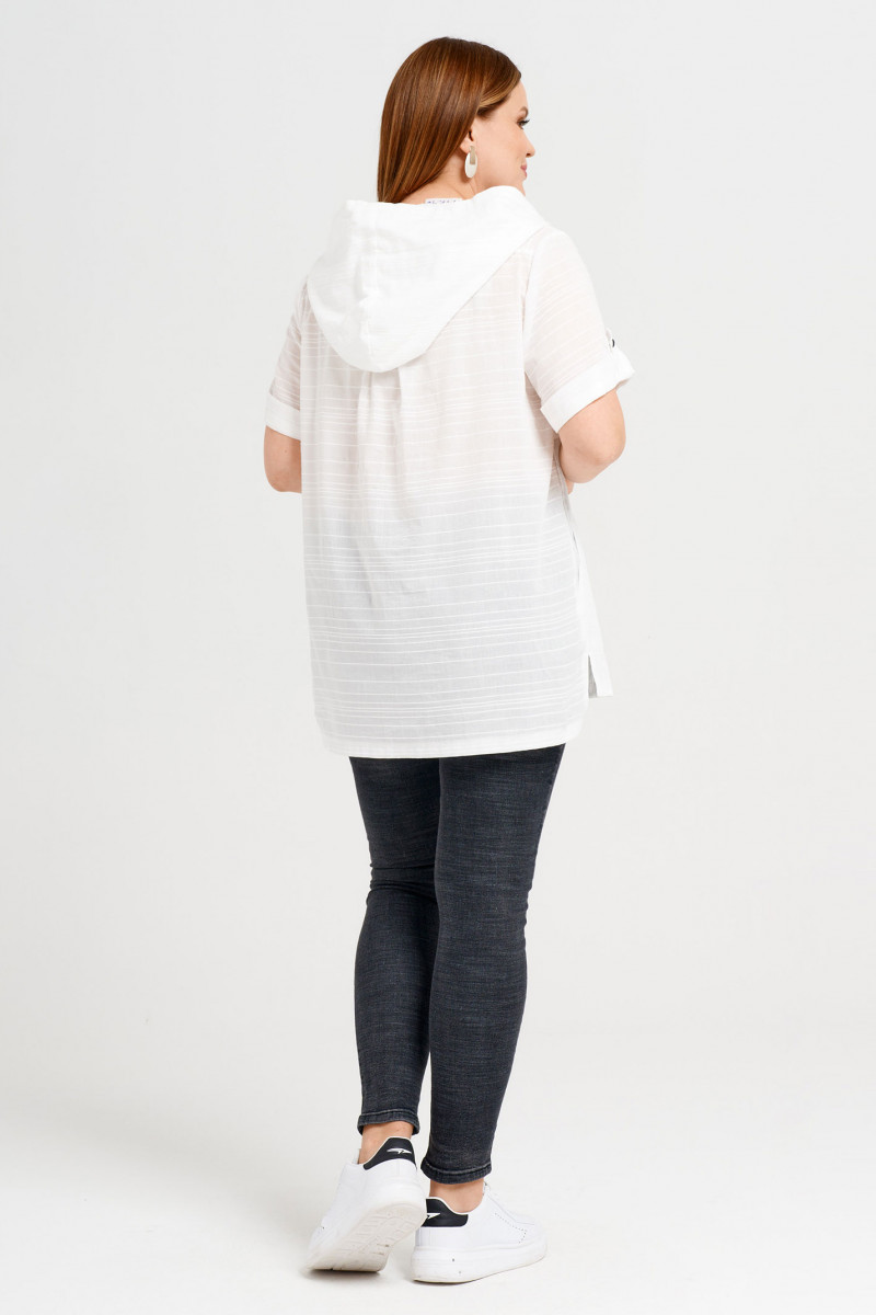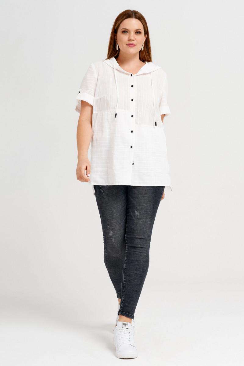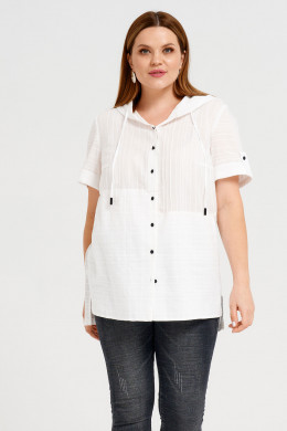 Блузка женская в спортивном стиле,прямого силуэта выполнена из натуральной хлопковой ткани. Застёжка спереди на петли и пуговицы контрастного цвета. В круглую горловину оформлен капюшон с кулисой из основной ткани с металлическими наконечниками . По переду выполнены горизонтальные подрезы на разном уровне. И вдоль застёжки по одной стороне -защипы. Нижние детали переда двойные. По бокам выполнены косые входы во внутренние карманы. Рукава втачные,длина выше локтя. По низу рукавов выполнены отложные манжеты, зафиксированные патой и пуговицей.Перед короче,чем спинка. По бокам выполнены разрезы. Прекрасный вариант летней блузки на каждый день для отдыха и работы.
