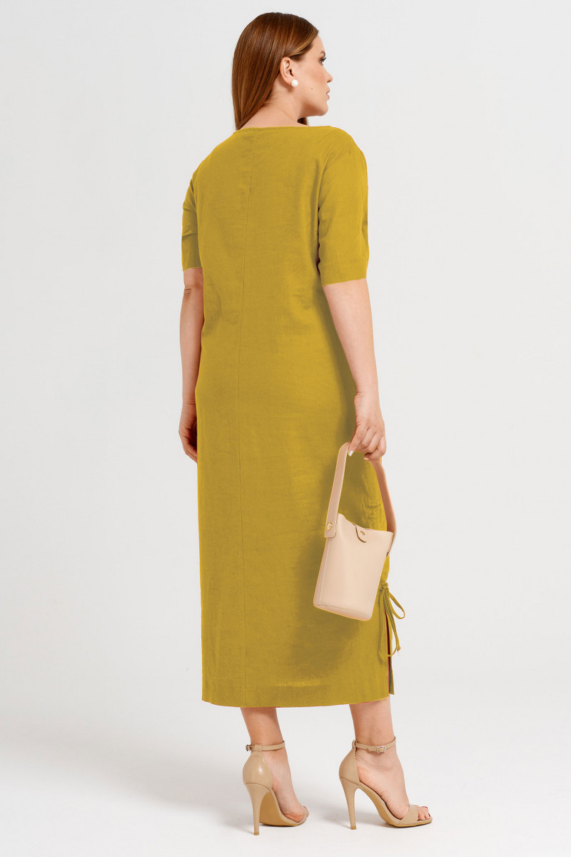 Шикарное платье из льняной ткани, свободного силуэта со средним швом, с подрезом, с нагрудными вытачками, с круглым вырезом горловины, в боковам шве кулиса и разрез, спинка прямая со средним швом. Рукава до локтя, втачные, с притачной манжетой. Отличный вариант как по случаю так и без него.