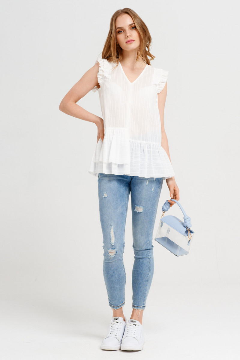 Легкость, романчтичность, очаровательность- это то, что объединяет обладательницу этой блузки . Эффектная блузка из хлопковой ткани, свободного силуэта, с V - образным вырезом горловины, по окату двойные крылышки со сборкой, с баской по линии низа и одним асимметричным воланом по низу. Спинка лаконичная, с баской по низу. Блузка создана для романтичных и изящных девушек, нет никаких сомнений в том , что обладательница этой блузы, будет выглядеть безупречно.