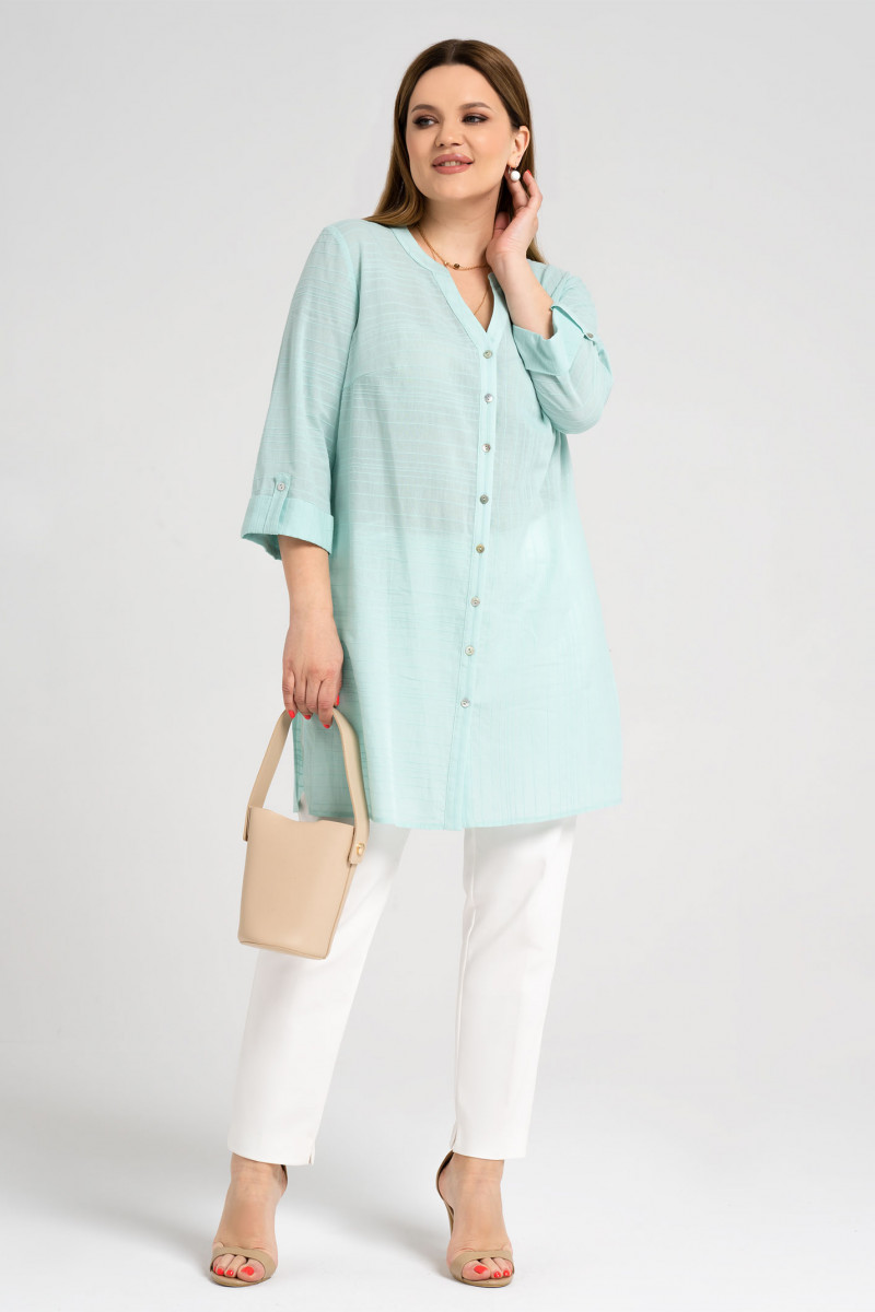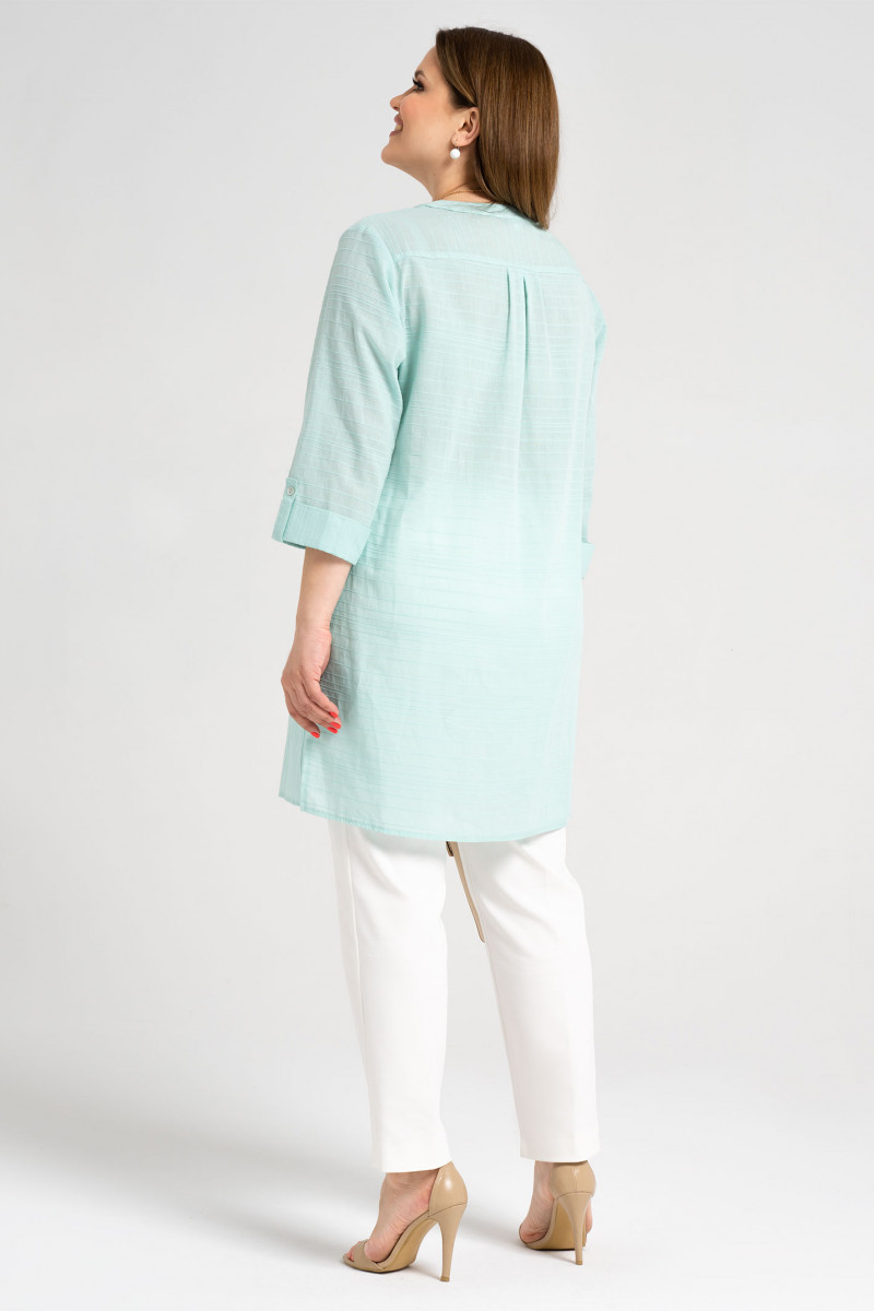 Стильная, лаконичная блузка, из хлопковой ткани, создана для девушек, которые умеют совмещать работу и отдых. Детали переда с V- образным вырезом горловины, от горловины планка , с центральной застежкой на петли пуговицы, с нагрудными вытачками, блузка удлиненная, в боковыхз швах разрезы. Спинка с кокеткой и складками от нее. Рукава втачные, 3/4, с отложными манжетами и патой. Отличный вариант для выхода в свет и отдыха.