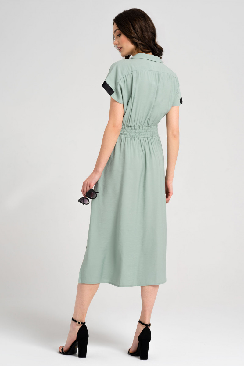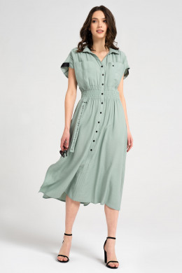 Платье из вискозной ткани. Платье полуприлегающего силуэта, к низу расширенное, с центральной застежкой на петли пуговицы, с кокетками с двумя нагрудными карманами, по линии талии резинка, от резинк декоративная деталь пояса с печатью, линия плеча спущенная в боковых швах карманы книзку разрезы. Спинка с кокеткой и сборкой, по линии талии резинка. Образ создан для молодых девушек, которые будут выглядеть эффектно, которые умеют совмещать работу и отдых.