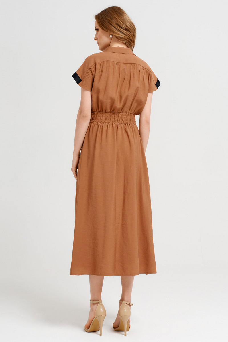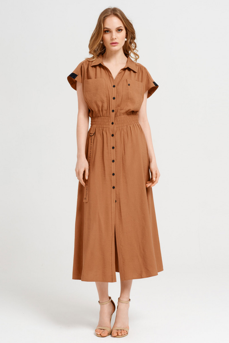 Платье из вискозной ткани. Платье полуприлегающего силуэта, к низу расширенное, с центральной застежкой на петли пуговицы, с кокетками с двумя нагрудными карманами, по линии талии резинка, от резинк декоративная деталь пояса с печатью, линия плеча спущенная в боковых швах карманы книзку разрезы. Спинка с кокеткой и сборкой, по линии талии резинка. Образ создан для молодых девушек, которые будут выглядеть эффектно, которые умеют совмещать работу и отдых.