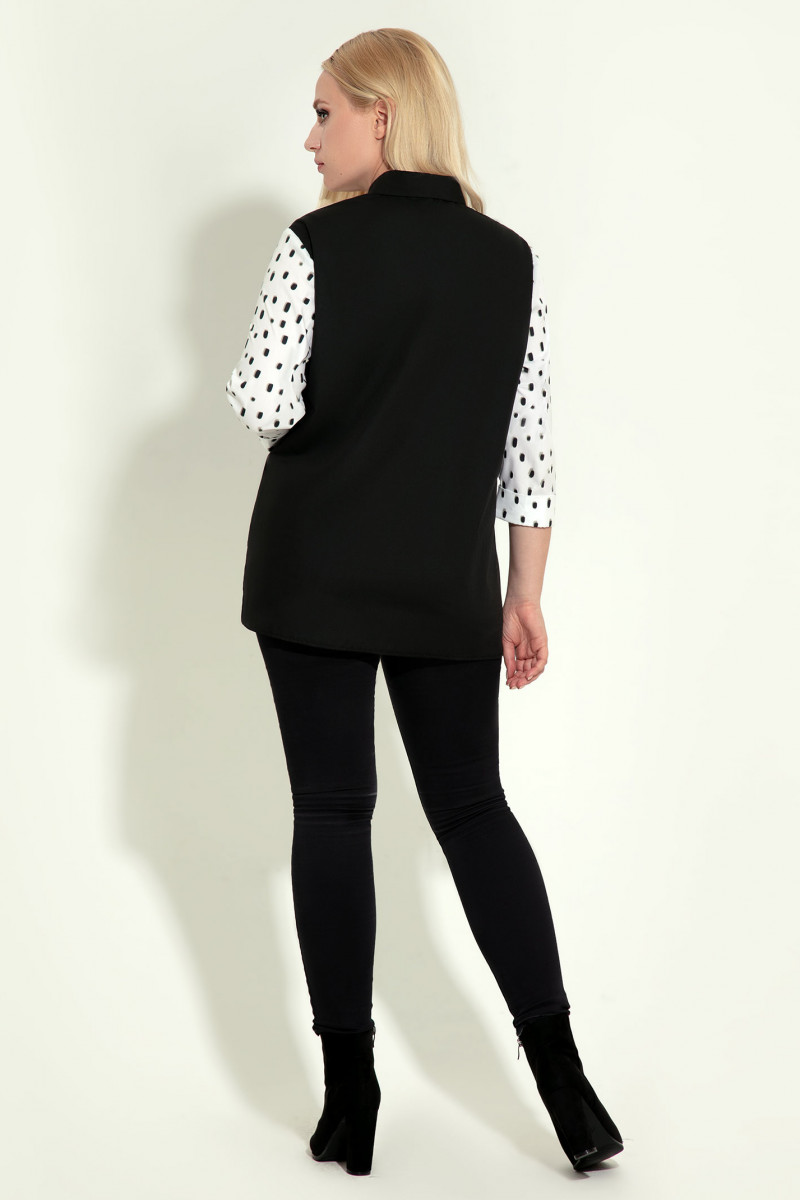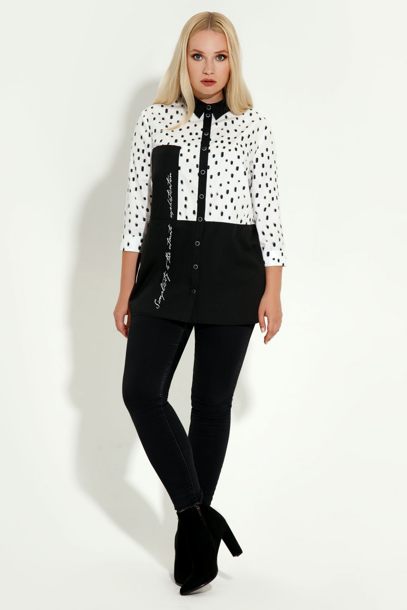Стильная и очень эффектная блузка построена на контрастных графичных сочетаниях чёрного и белого. Рукав длиной 3/4 застёгивается на две пуговицы на отрезном манжете. Воротник рубашечный,на стойке. Застёжна спереди на отрезную планку с петлями и пуговицами. По переду выполнен горизонталиный рез и накладной карман . Нижняя деталь переда и карман декорированя шрифтовым принтом. Спинка однотонная чёрная. Прекрасный вариант рубашки на каждый день для стильной ,девушки, стремящейся выглядеть эффектно и привлекательно.
