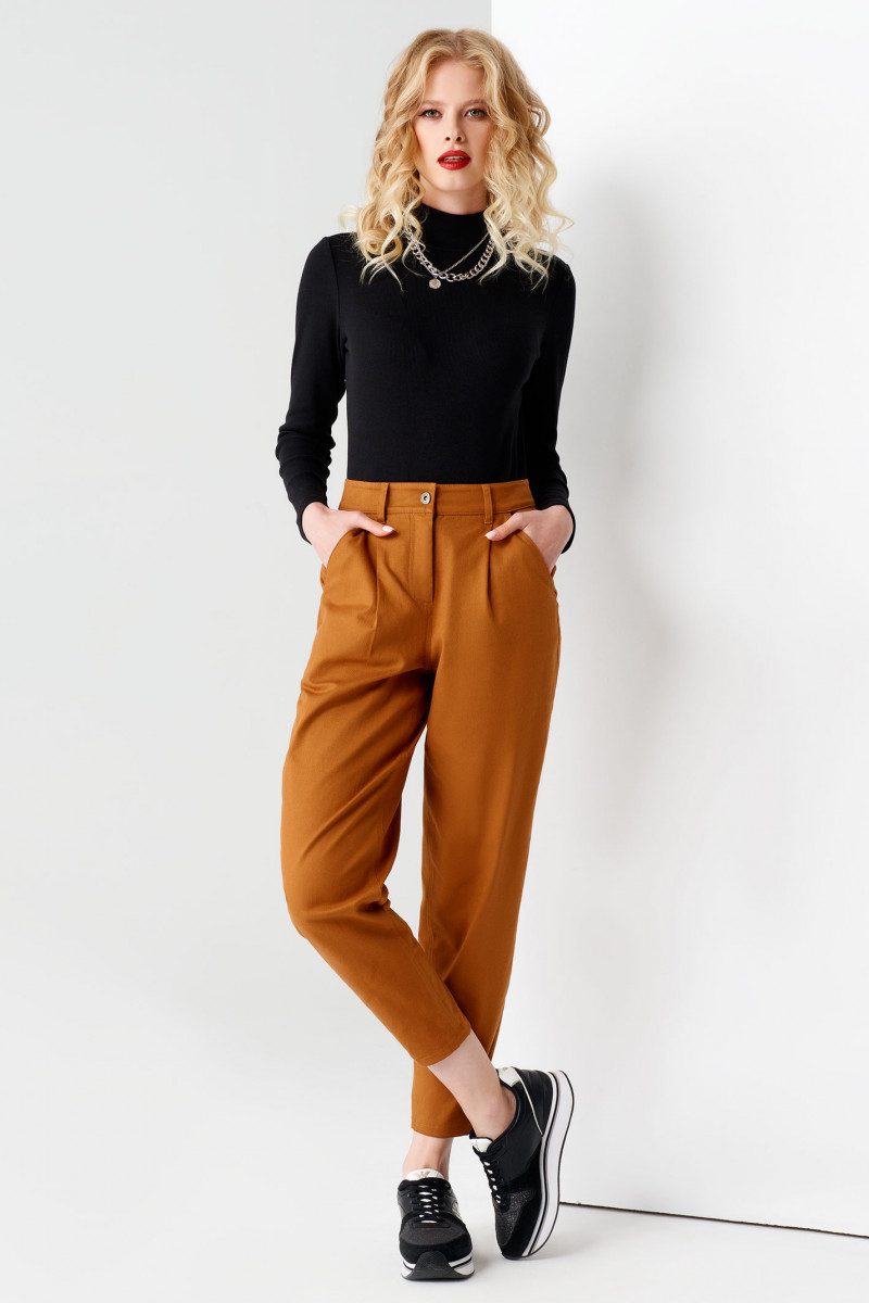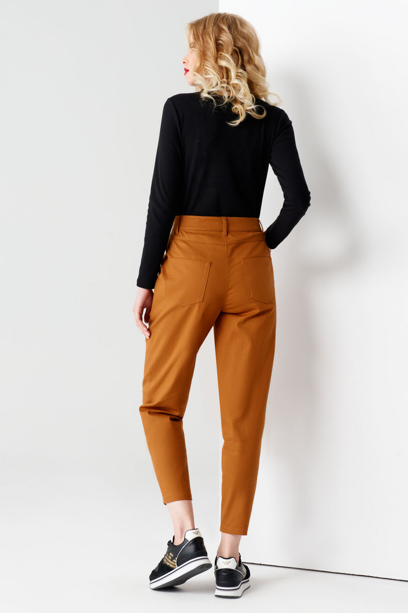 Очень модные брюки с высокой посадкой выполнены из плотной хлопковой ткани. По талии выполнен отрезной пояс со шлёвками для ремня. Застёжка спереди на молнию с гульфиком и петлю-пуговицу на поясе. От верхнего среза к боковым швам выполнены входы во внутренние карманы и две односторонние складки. По спинке выполнена отрезная кокетка и два накладных кармана. Брюки заужены книзу и укорочены. Стильные и удобные брюки на каждый день для яркой девушки.